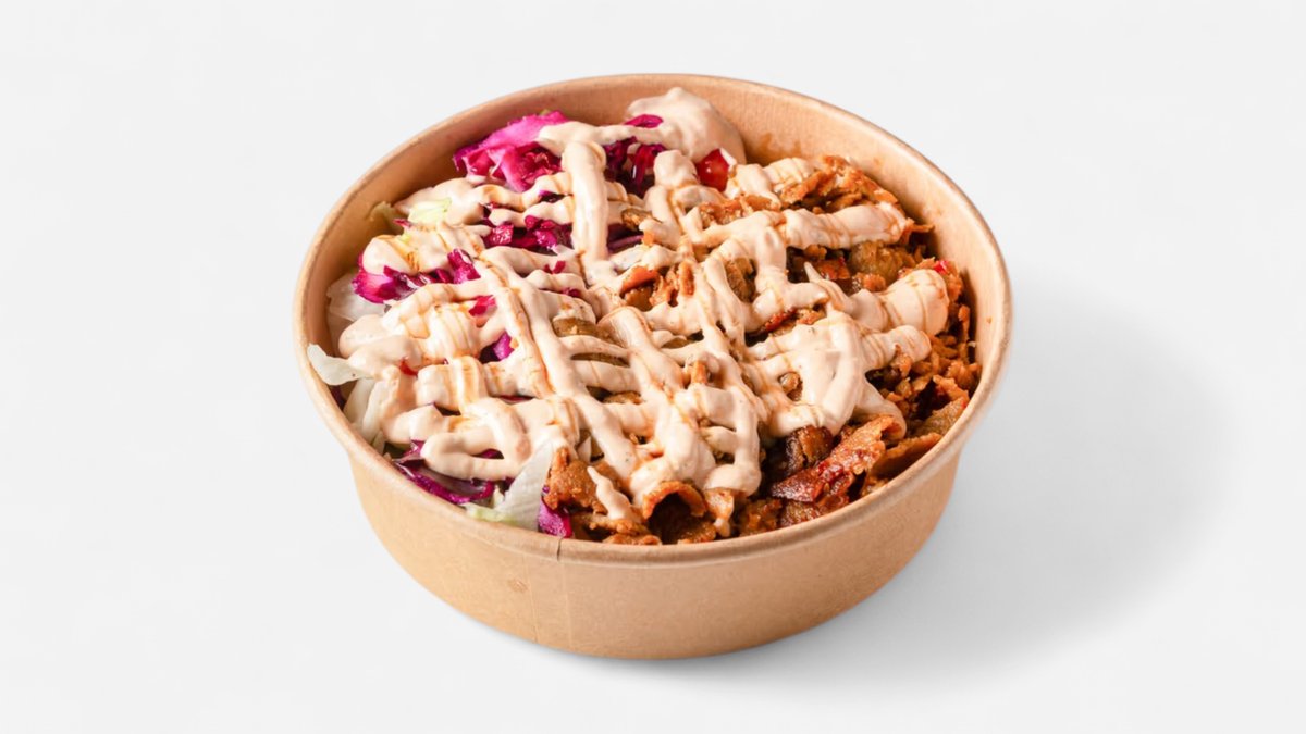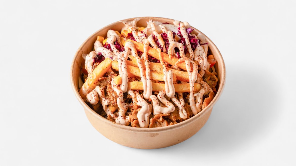 Kebab, pommes frites, salat, tomat, rødløg og dressing.