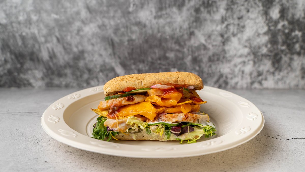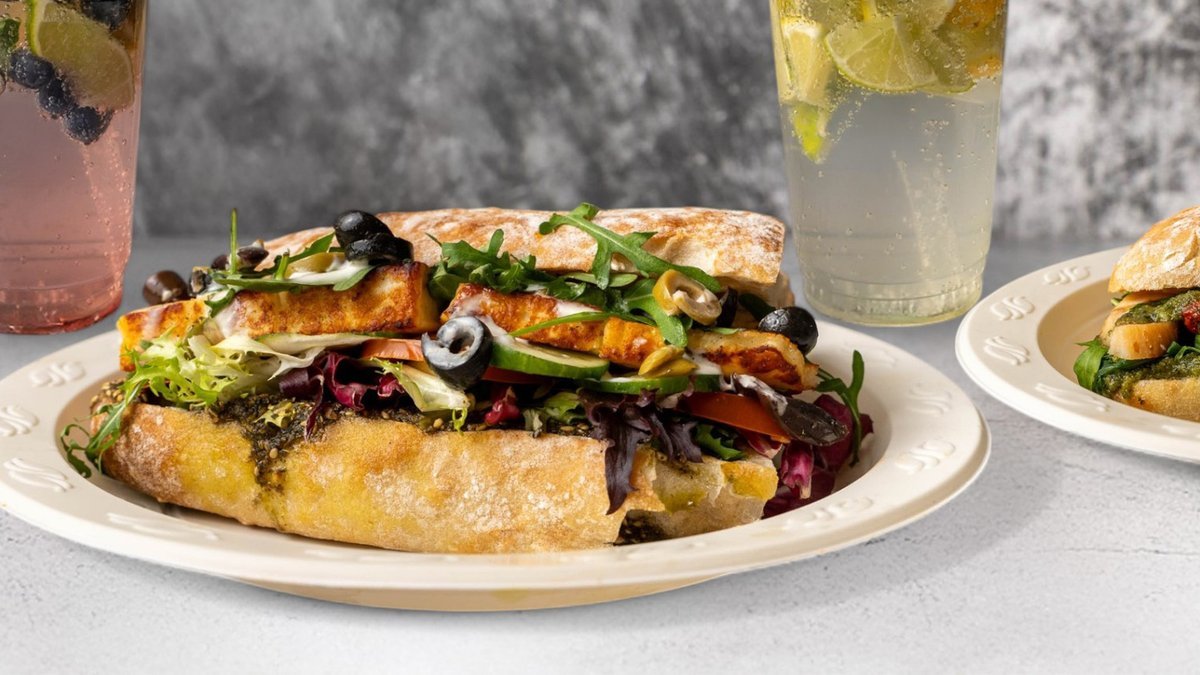 Valgfrit brød med fyld af kyllingestrimler, pesto, rucola, mozzarella, soltørrede tomater, mynteblade og balsamico.