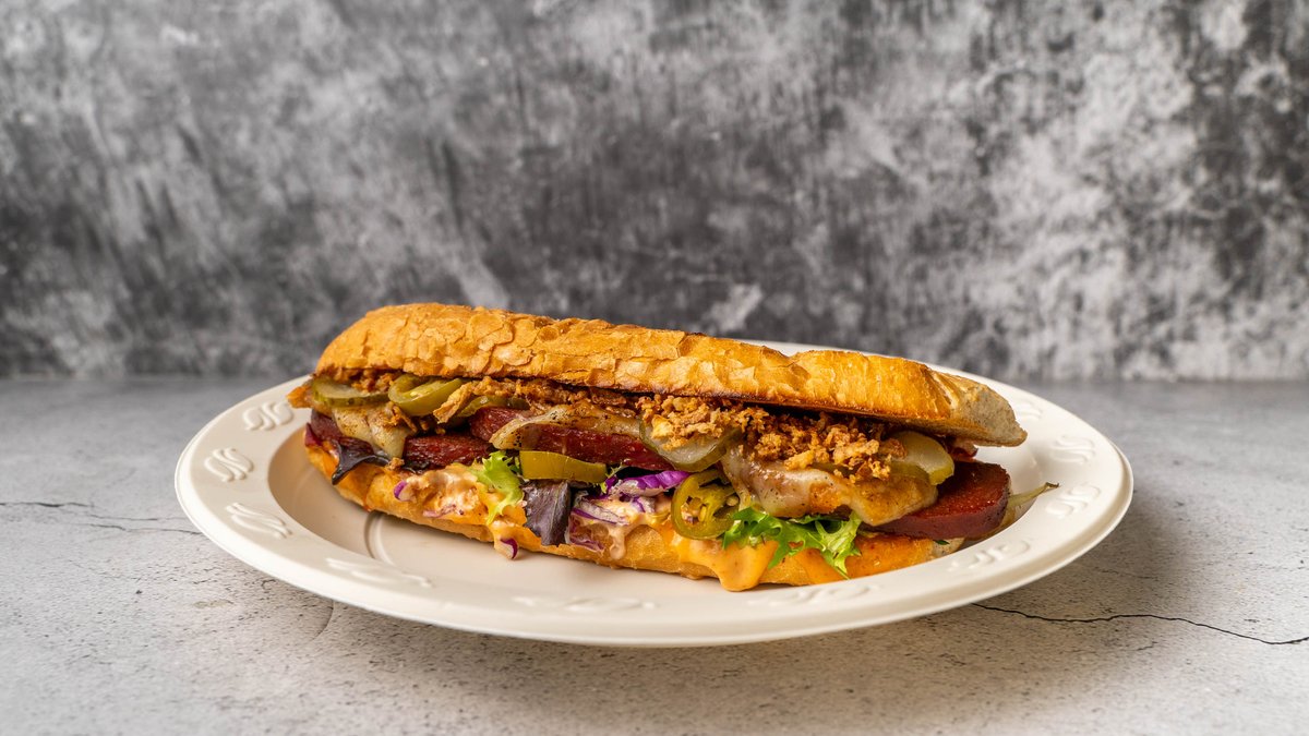 Valgfrit brød med fyld af sucuk, revet mozzarella, syltede agurker, jalapeños, ristede løg og chilimayo.