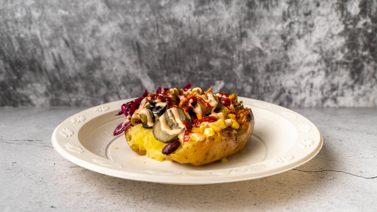 Stor og perfekt bagt kartoffel med fyld af valgfri smørelse, protein, salat, tilbehør og dressing.