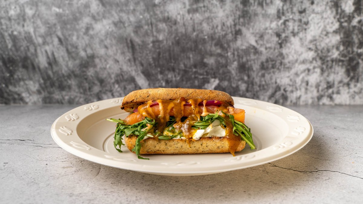 Valgfrit brød med fyld af røget laks, flødeost, rucola, syltede rødløg og chilimayo.
