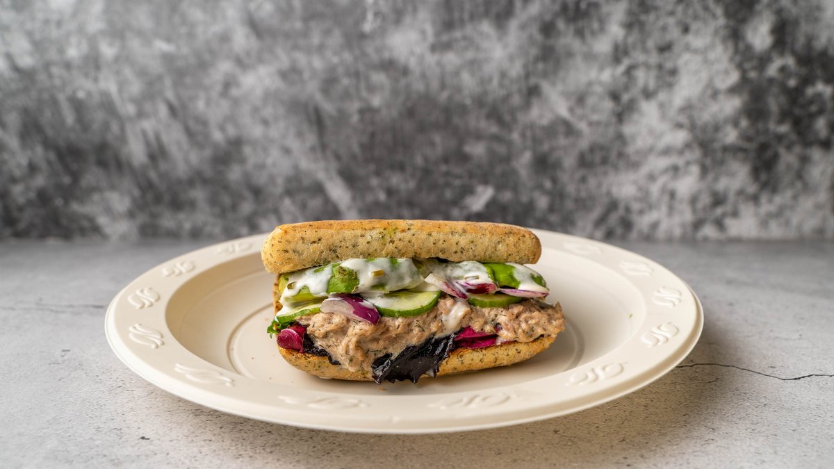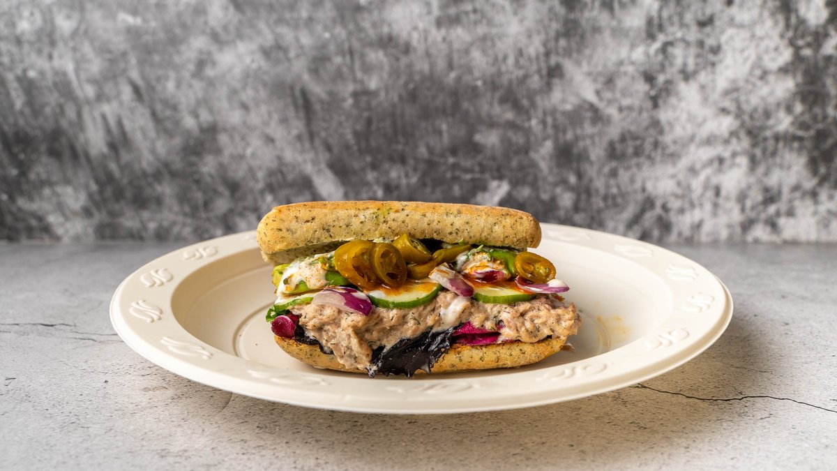 Valgfrit brød med fyld af hjemmelavet tunmousse, avocado, salat, agurk, rødløg, jalapeños, tabasco og creme fraiche-dressing.