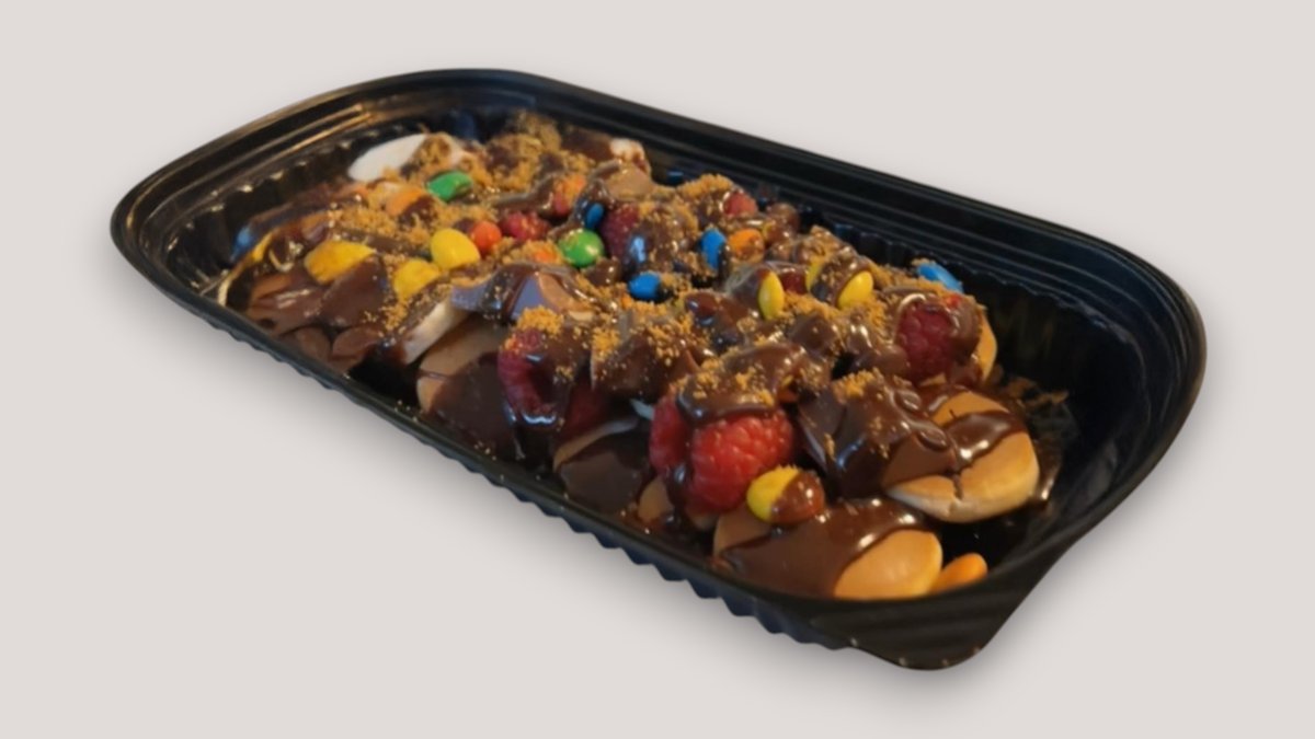 12stk med to valgfri frugter, to slags chokolade, sauce og krymmel.