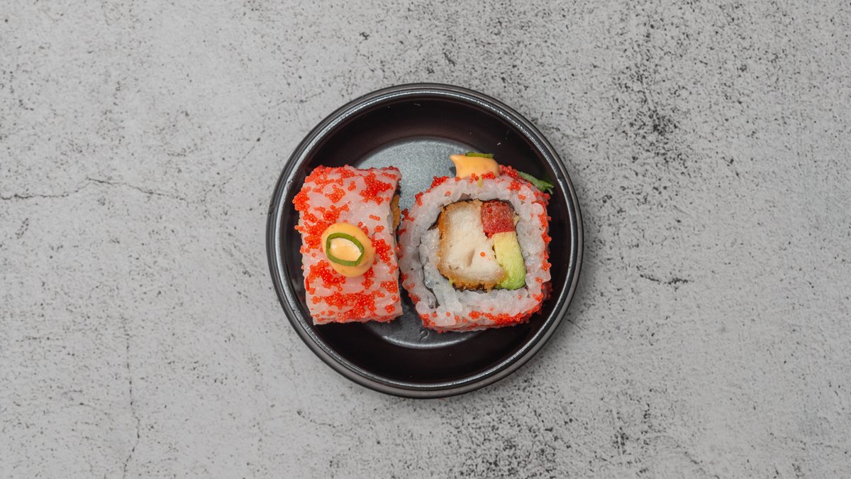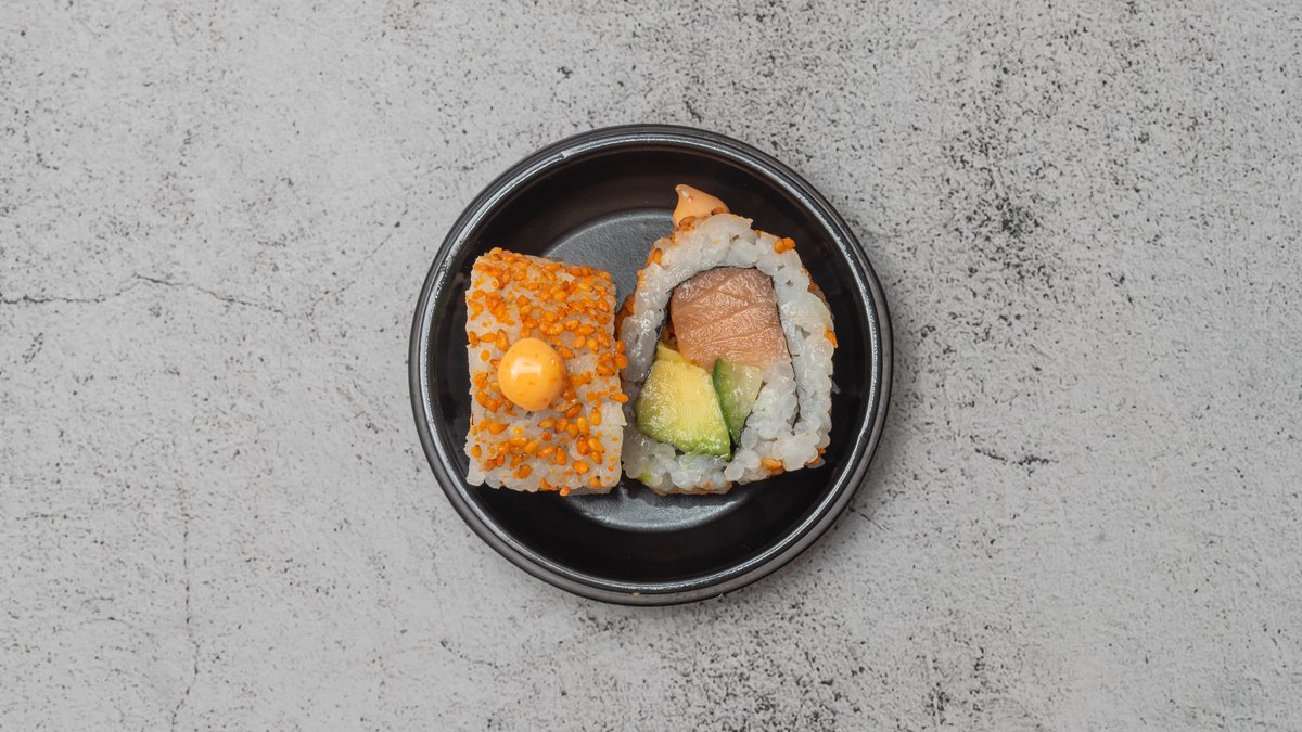 Dybstegt laks, agurk, avocado, chilimayo og mayo Rullet i rød masago.