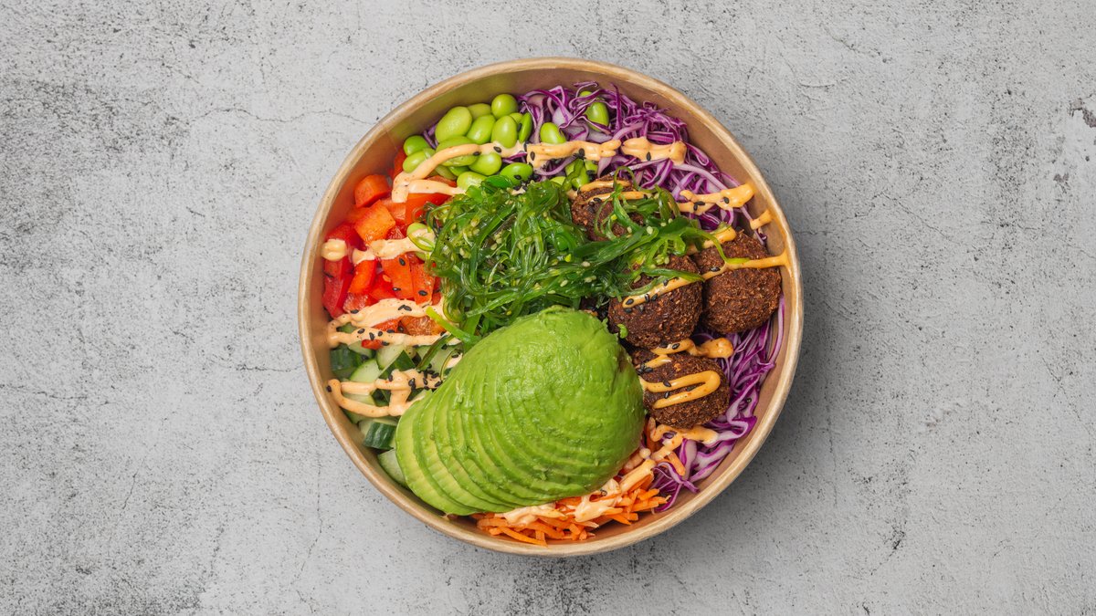 På bund af sushiris med sprød spidskål, friske grøntsager, tangsalat, sort sesam, chilimayo og japansk wasabi lime marinade. Toppes med falafel.