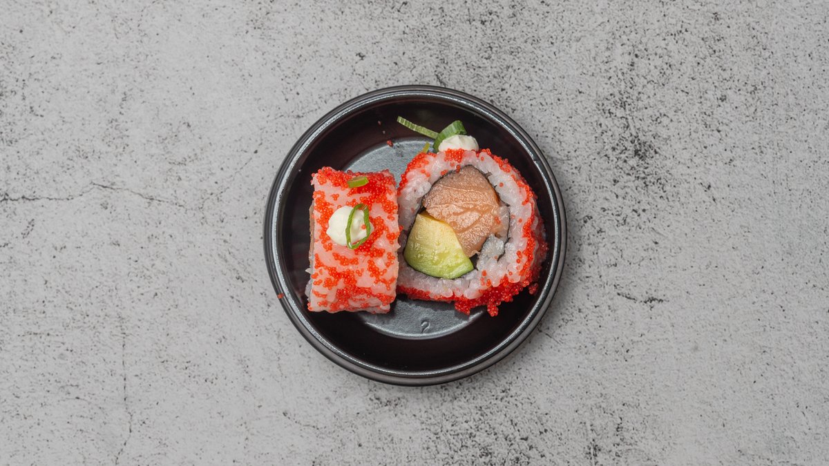 Flødeost, avocado, laks og forårsløg Toppes med rød masago.