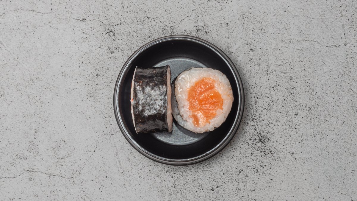 Bolle af ris toppet med rå fisk eller grøntsager, kommer i par af 2 stk.