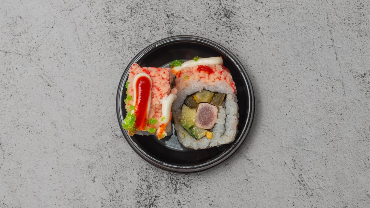 Surimi crapfish, tun, agurk og avocado Toppes med forårsløg siracha og jalapeños.