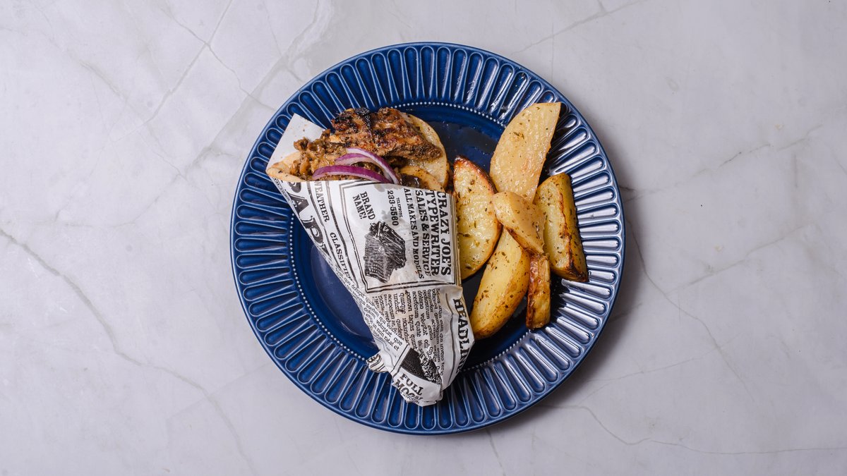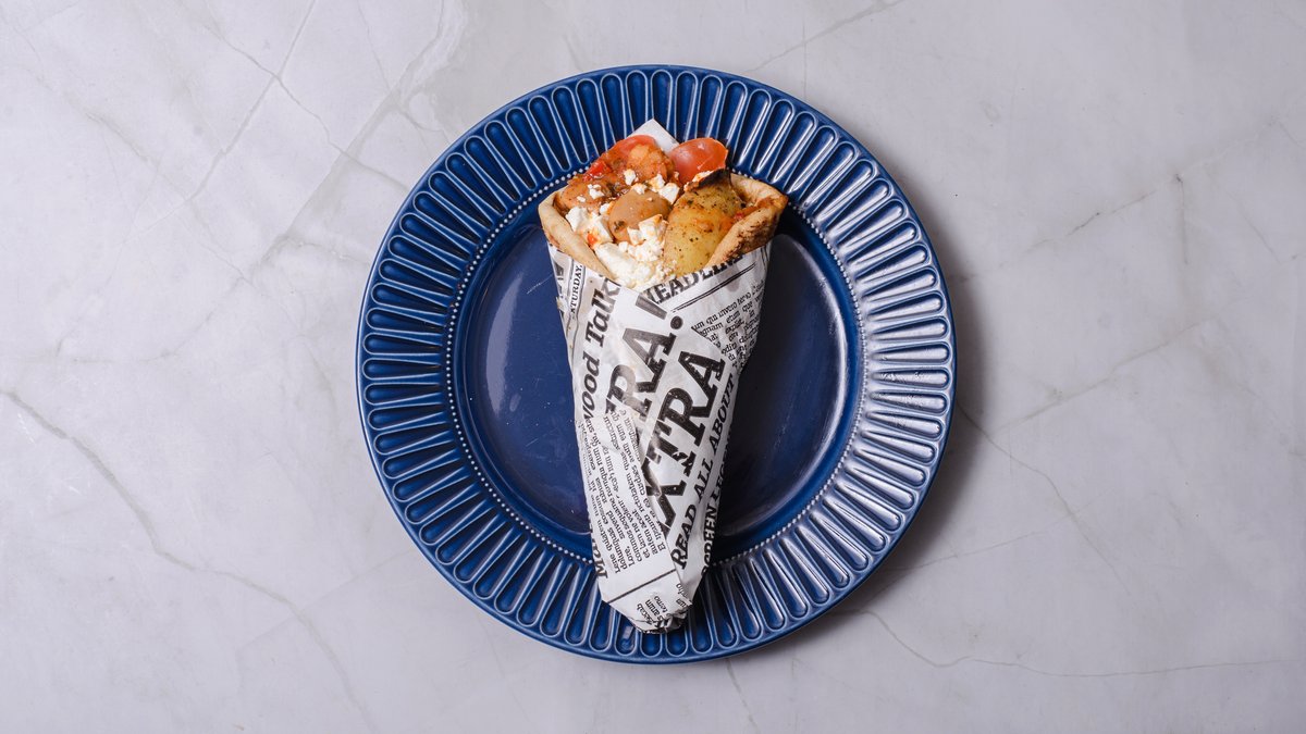 Med fyld af valgfri protein, tzatziki, rødløg og tomat. Serveret med græske kartofler og valgfri drikkevare.