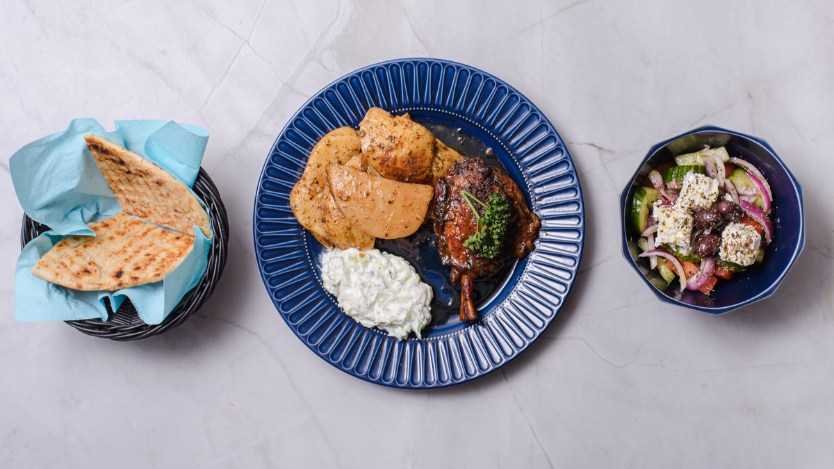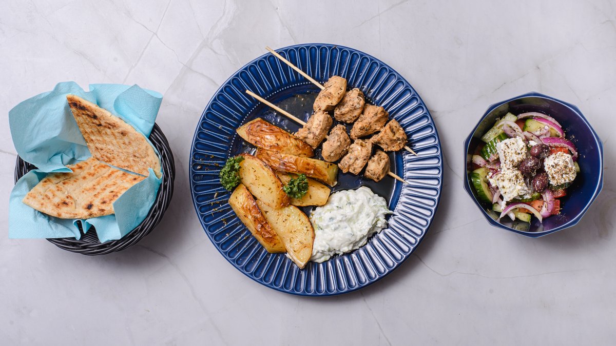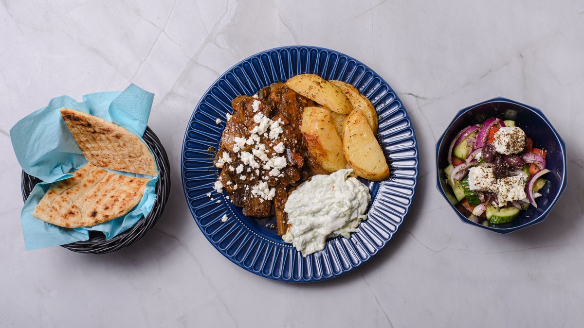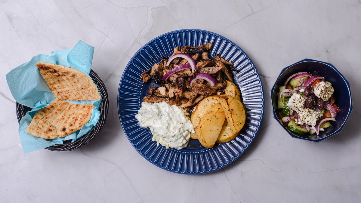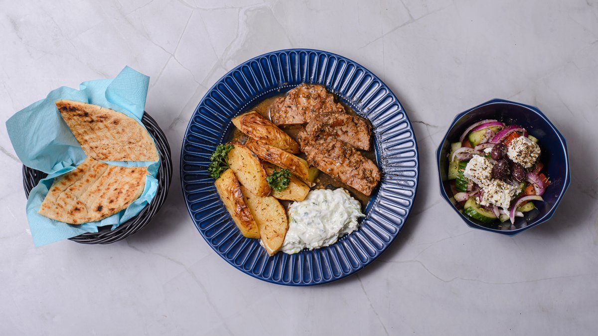 Langtidsmarineret svinekød, græske kartofler, tzatziki, græsk salat og brød.