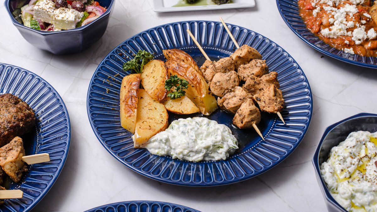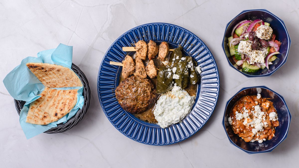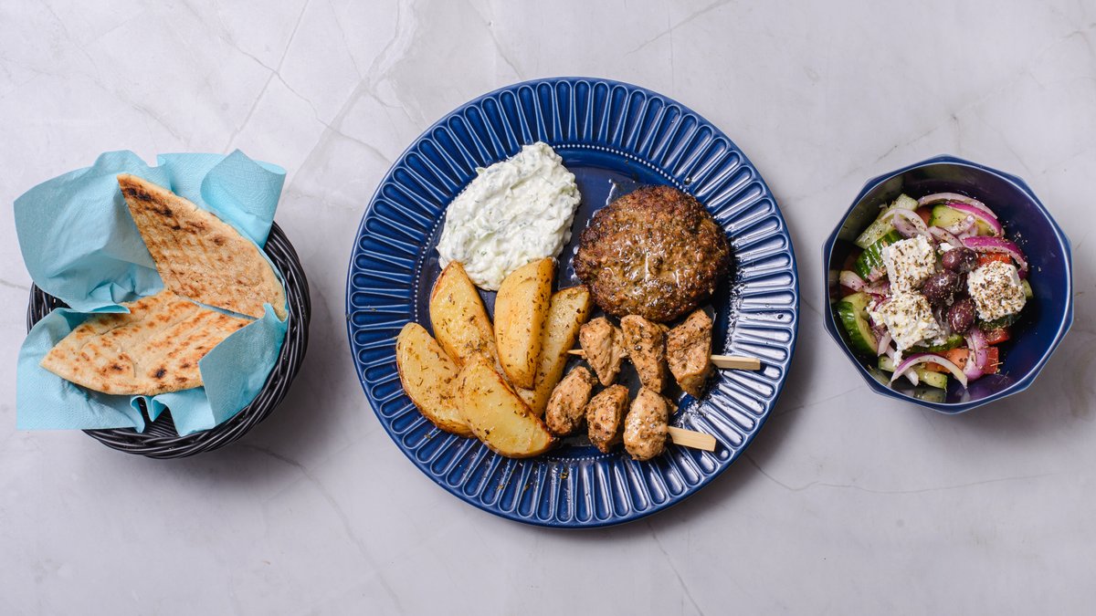 2 valgfrie slags kød, græske kartofler, tzatziki, græsk salat og brød.