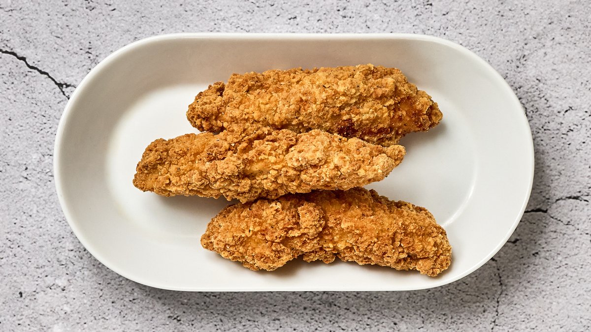 Briochebolle med fyld af fried chicken, cheddarost, salat, løg, tomat, pickles, mayonnaise og ketchup.