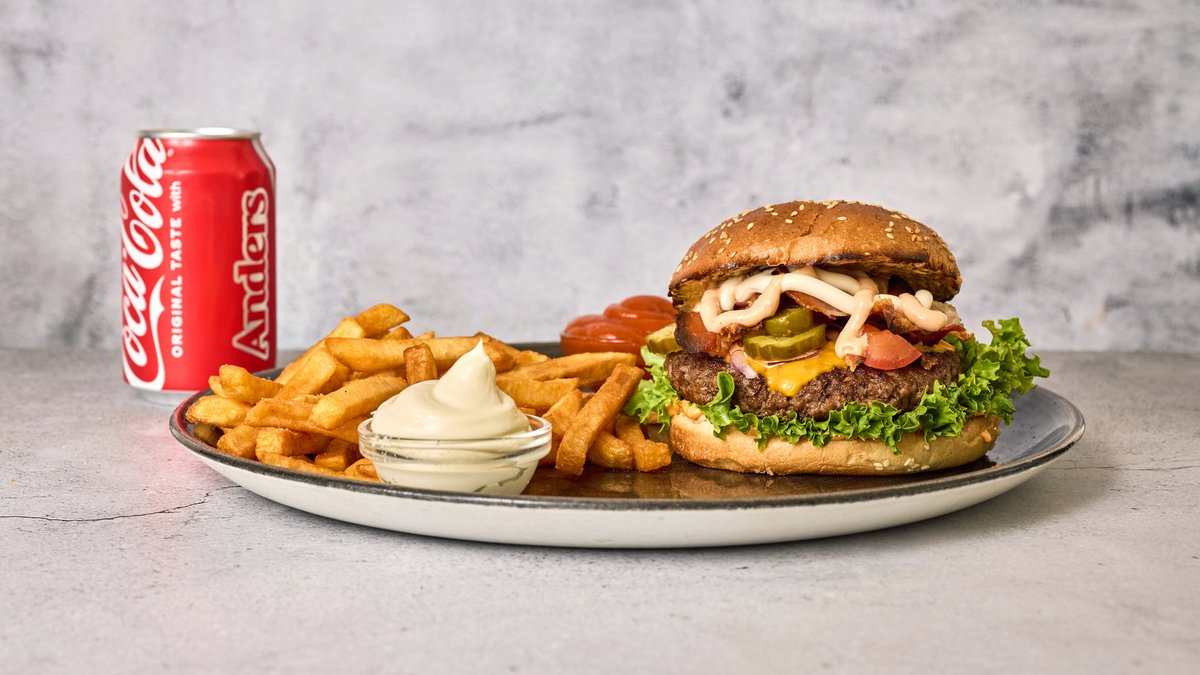 Valgfri burger serveres med pommes frites og valgfri sodavand.
