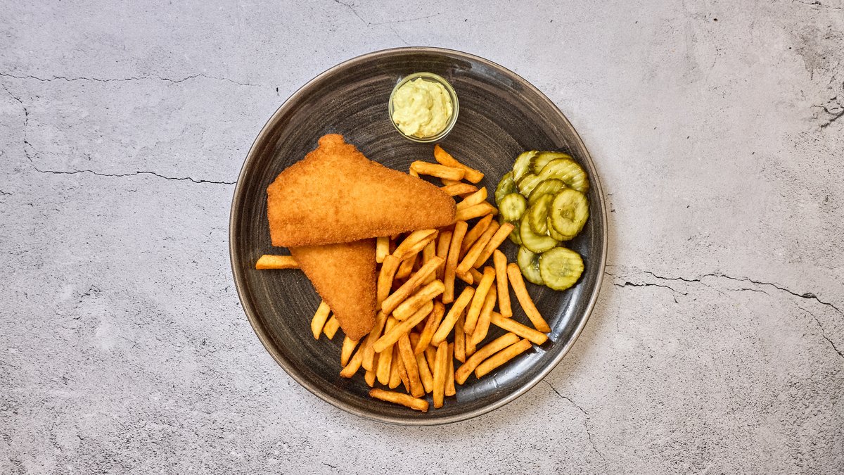 Fladbrød med fyld af valgfri protein serveres med pommes frites og valgfri sodavand.