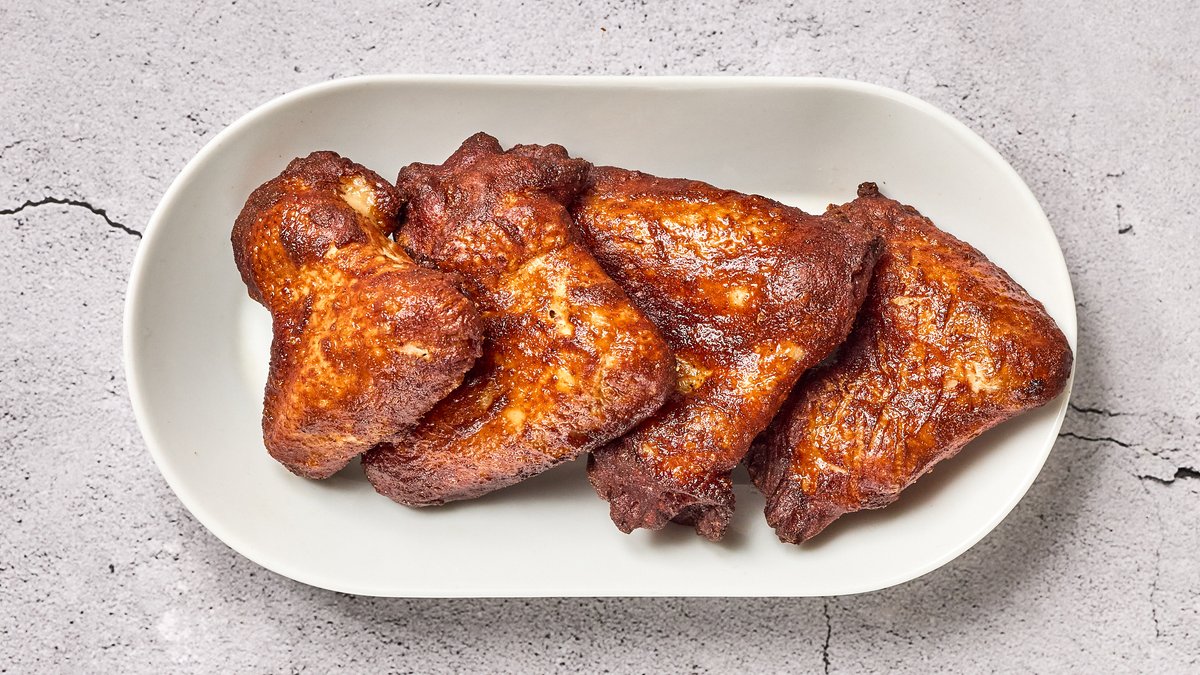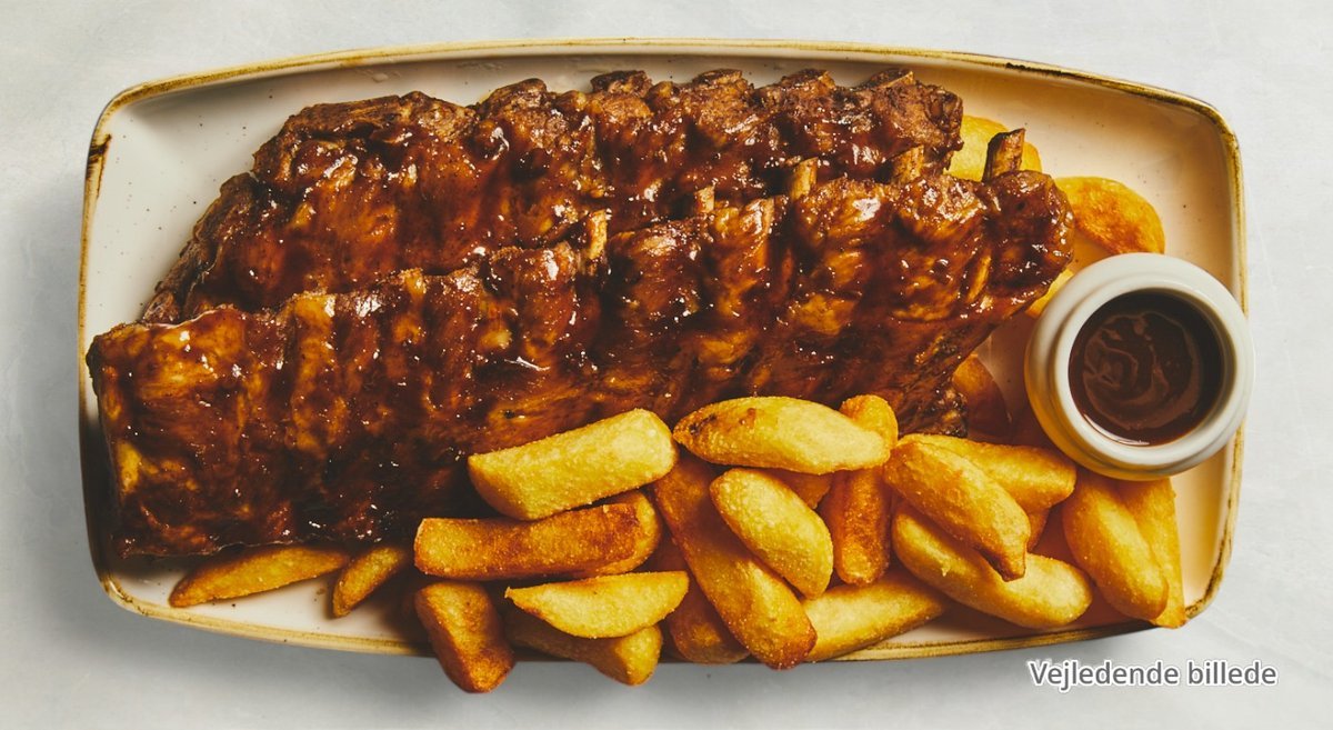 Serveres med salat, pommes frites, bbq-sauce og bearnaisesauce.