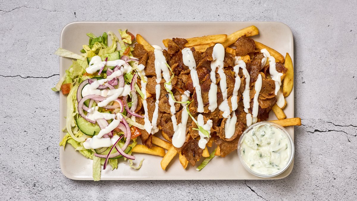 Kebab, salat, rødløg, tomat, agurk creme fraiche dressing og tzatziki.