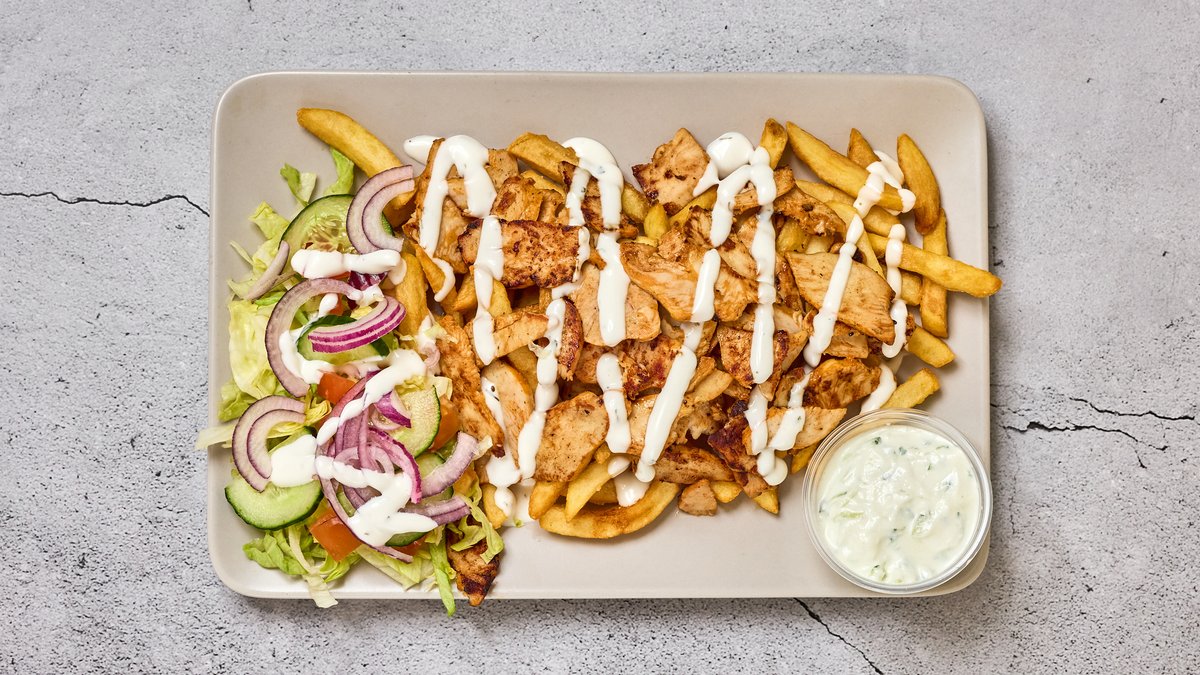 Kylling, salat, rødløg, tomat, agurk creme fraiche dressing og tzatziki.