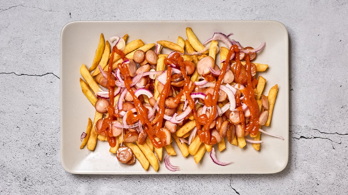 Pizzasandwich med fyld af valgfri protein serveres med pommes frites af valgfri sodavand.
