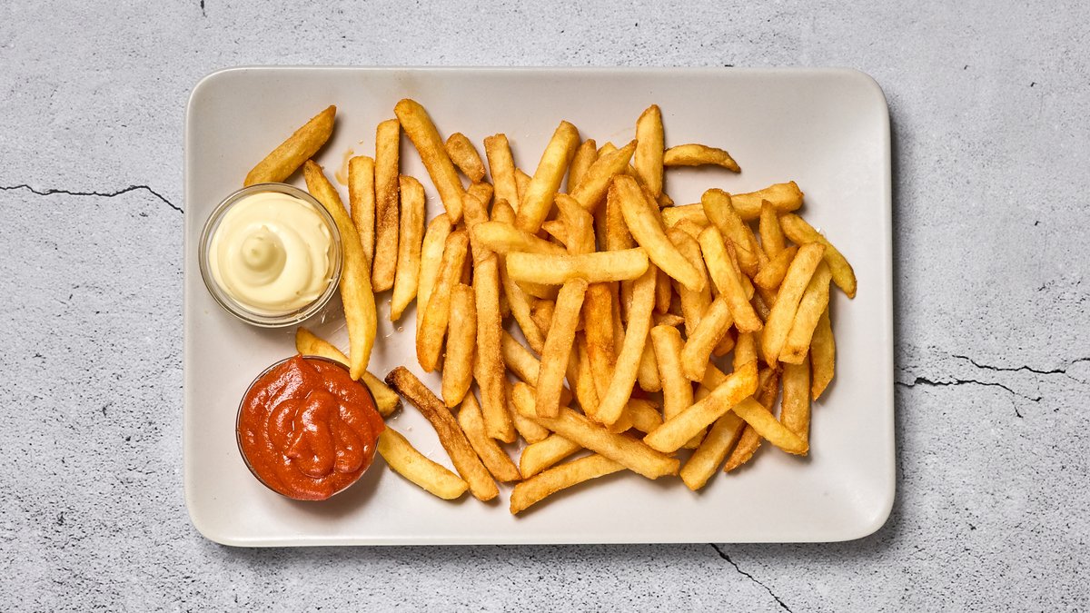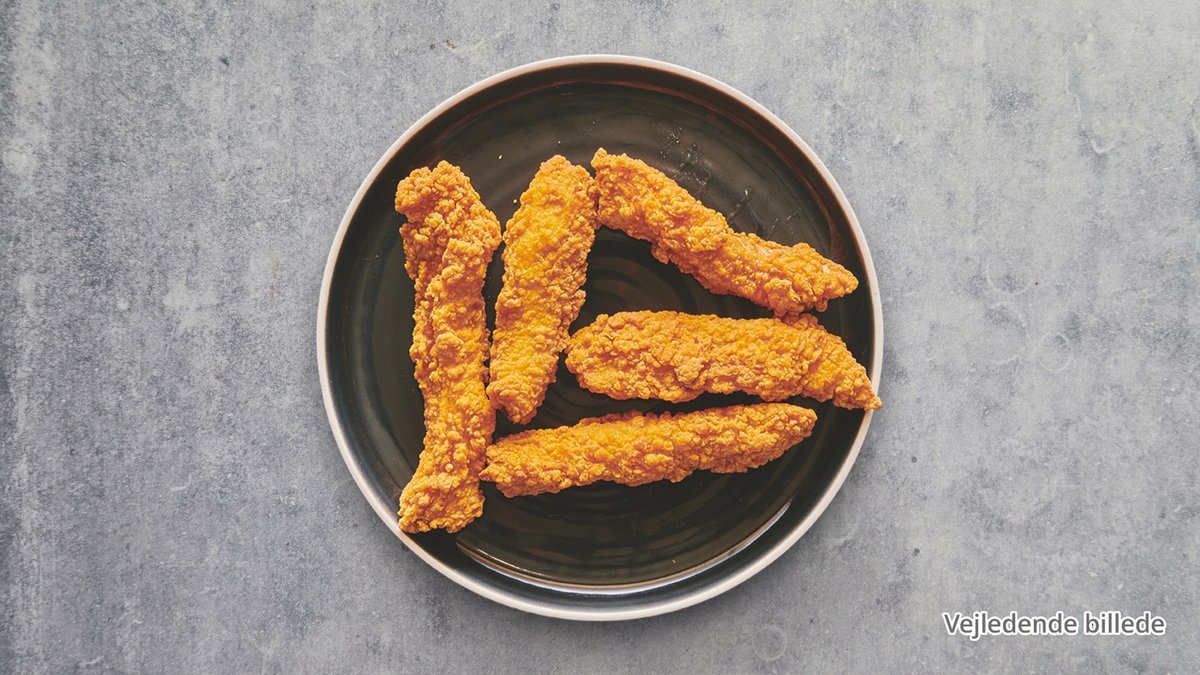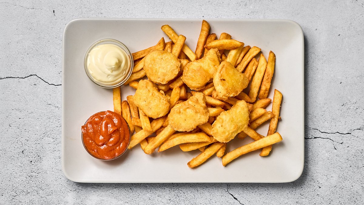 Burgerbolle med fyld af kylling, salat, mayonnaise og ketchup. Serveres med pommes frites.
