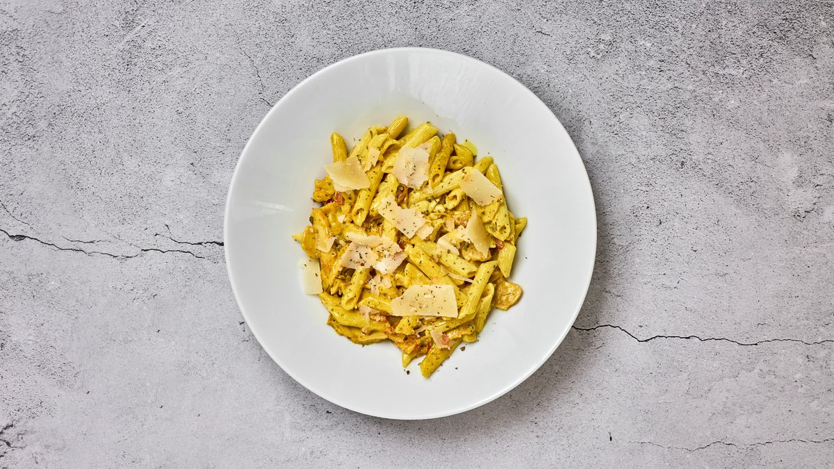 Penne vendt i flødesauce med kylling, ananas, peberfrugt, karry og parmesan.