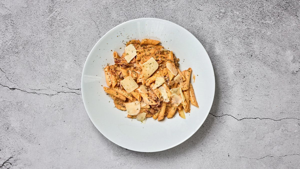 Penne vendt i flødesauce med krydret oksekød, bacon, champignon, rødløg, parmesan, tomat og gorgonzola.