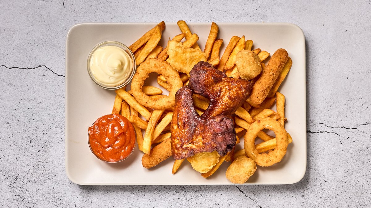 2 x Onion rings 2 x Chili cheese tops 2 x Hot wings 2 x Nuggets 2 x Mozzarellasticks Serveres med pommes frites.
