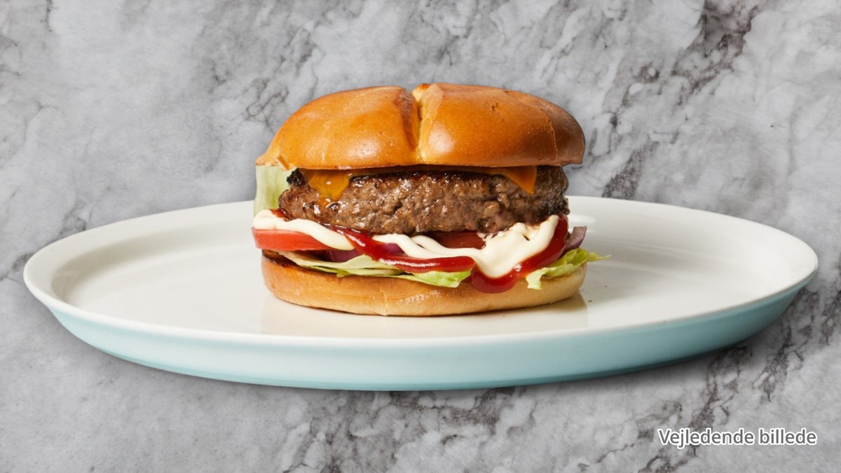 Burgerbolle med fyld af 100g bøf, salat, mayonnaise og ketchup. Serveres med pommes frites.