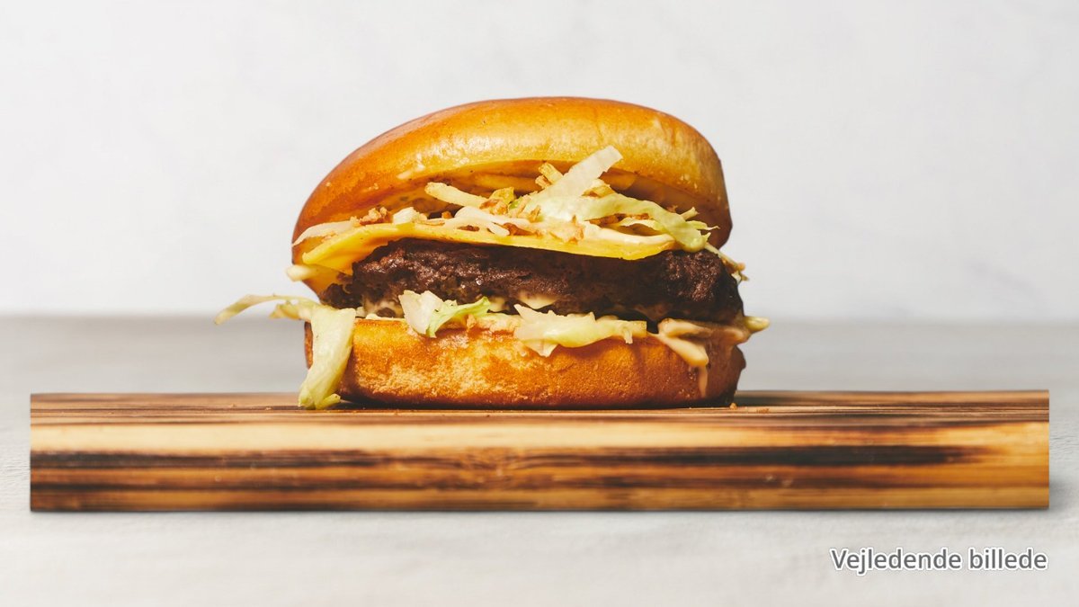 Briochebolle med fyld af 200g bøf, cheddarost, salat, løg, tomat, pickles, stegte champignoner, bbq-sauce og mayonnaise.