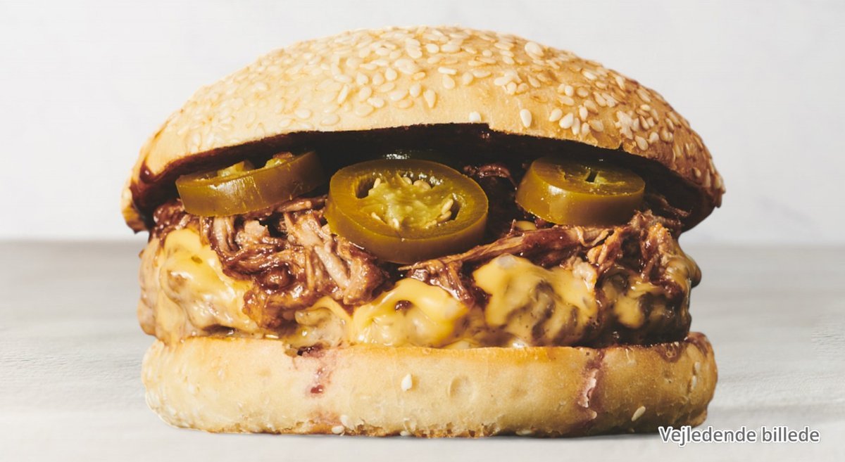 Briochebolle med fyld af 200g bøf bøf, cheddarost, salat, løg, tomat, pickles, chilimayo, chilicheese tops og jalapeños.