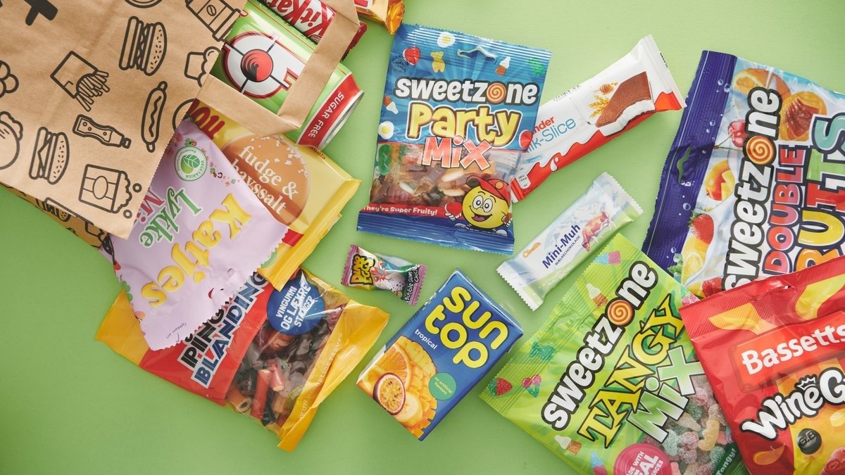 Bredt udvalg af slik, drikkevarer og kioskvarer