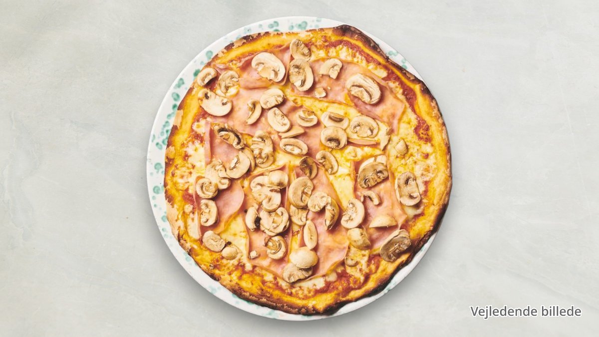 Tomatsauce, ost, skinke og champignon.