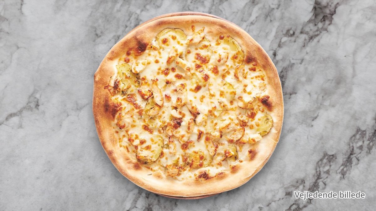 Tomatsauce, ost, kylling, bacon og creme fraiche dressing.