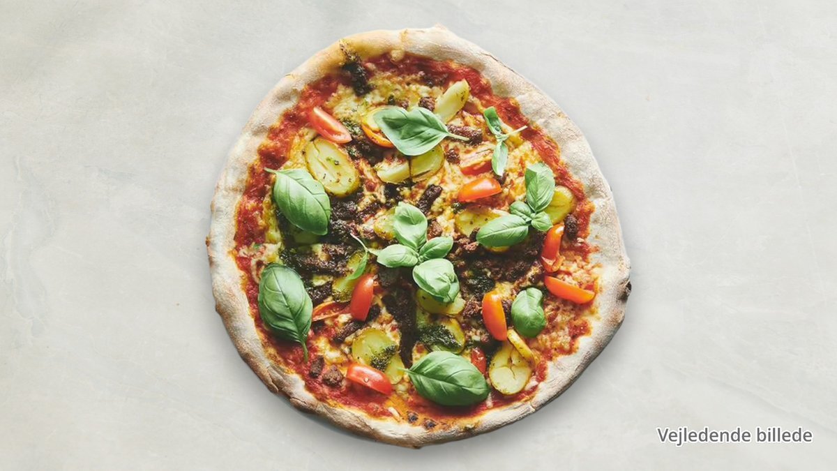 Tomatsauce, ost, kødstrimler, kartofler, cherrytomat, rucola, pesto og parmesanost.