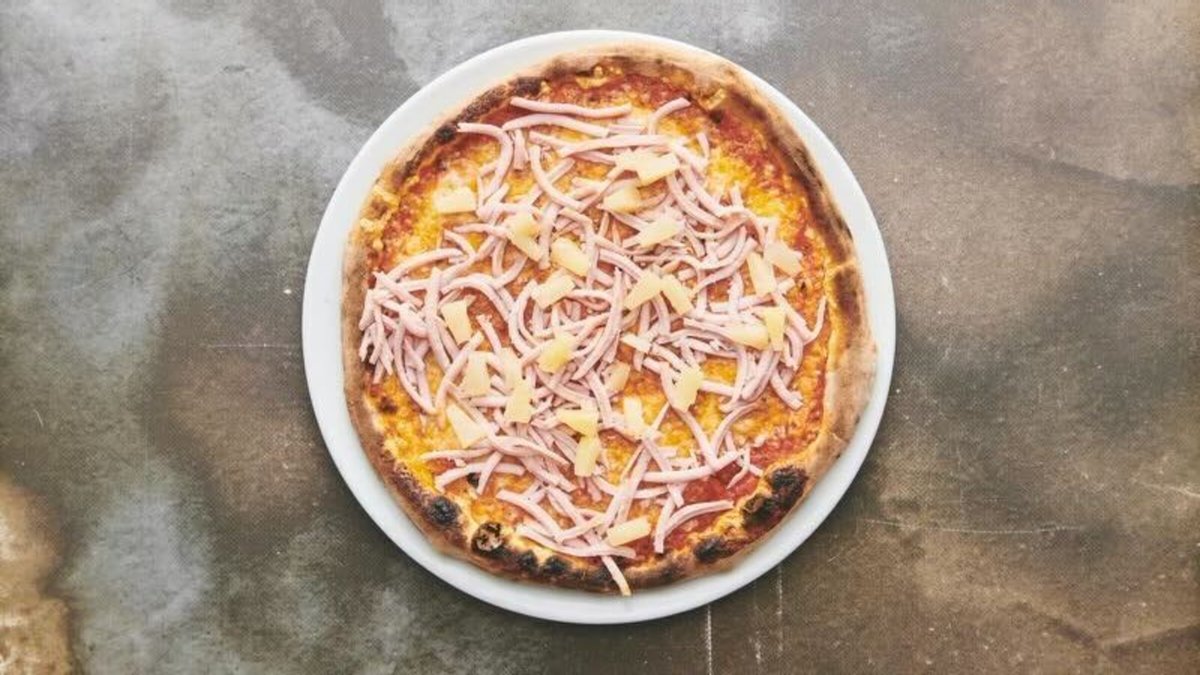 Tomatsauce, ost, champignon, løg, ananas og paprika.