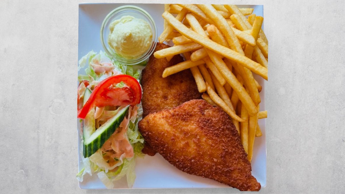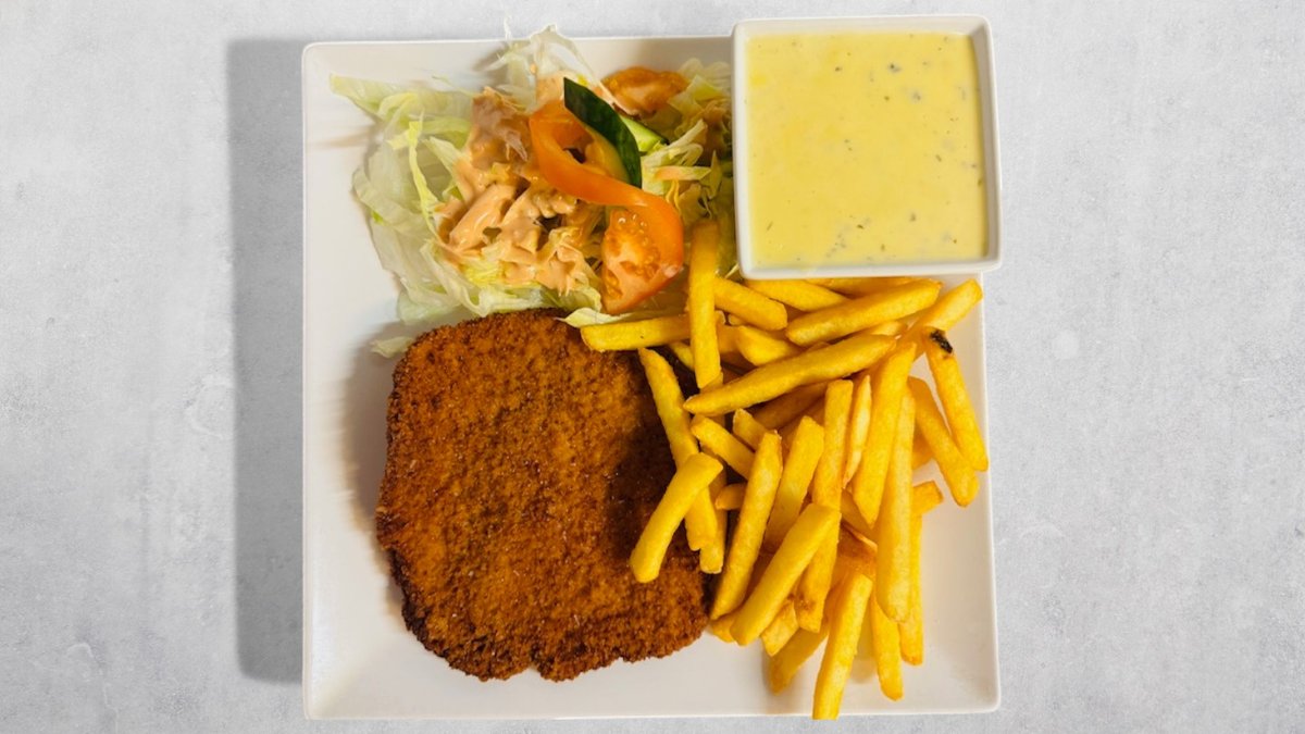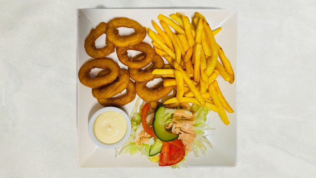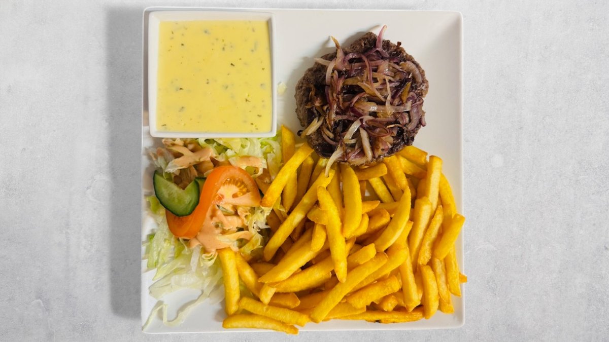 Serveres med bløde løg, pommes frites, salat og bernaisesauce.