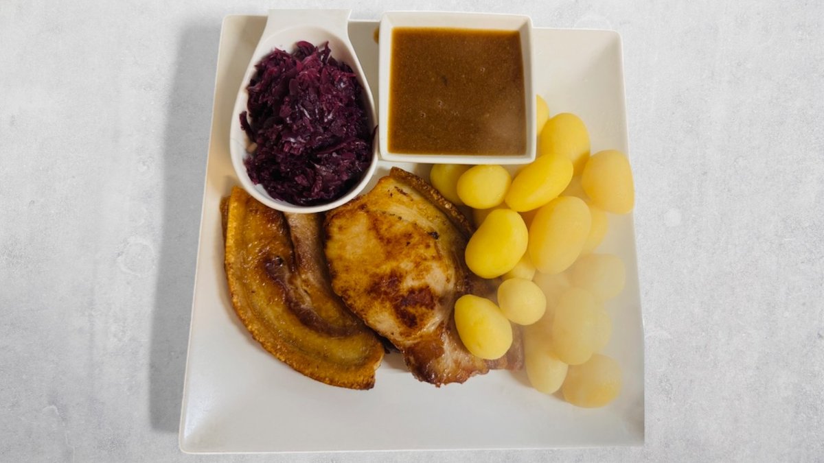 Flæskesteg i burgerbolle med rødkål, agurkesalat og mayonnaise.