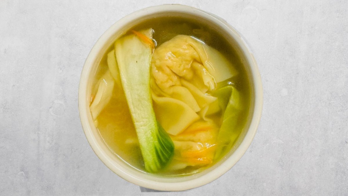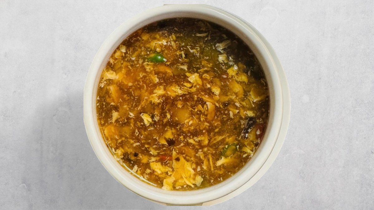 Syrlig suppe med kød, æg og grøntsager. Stærk