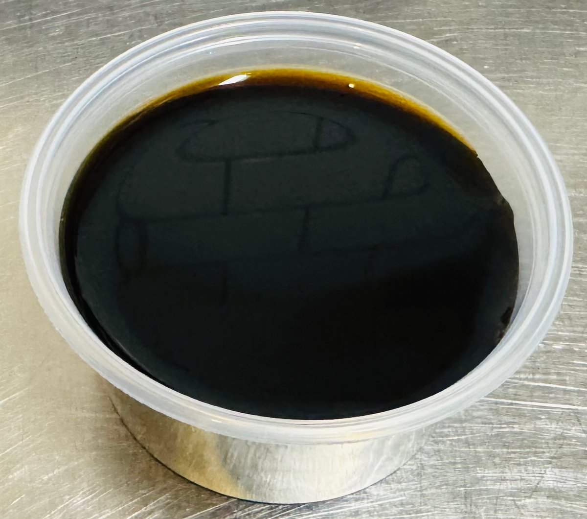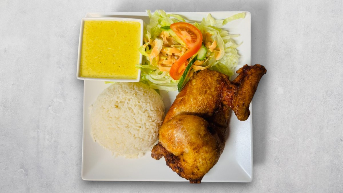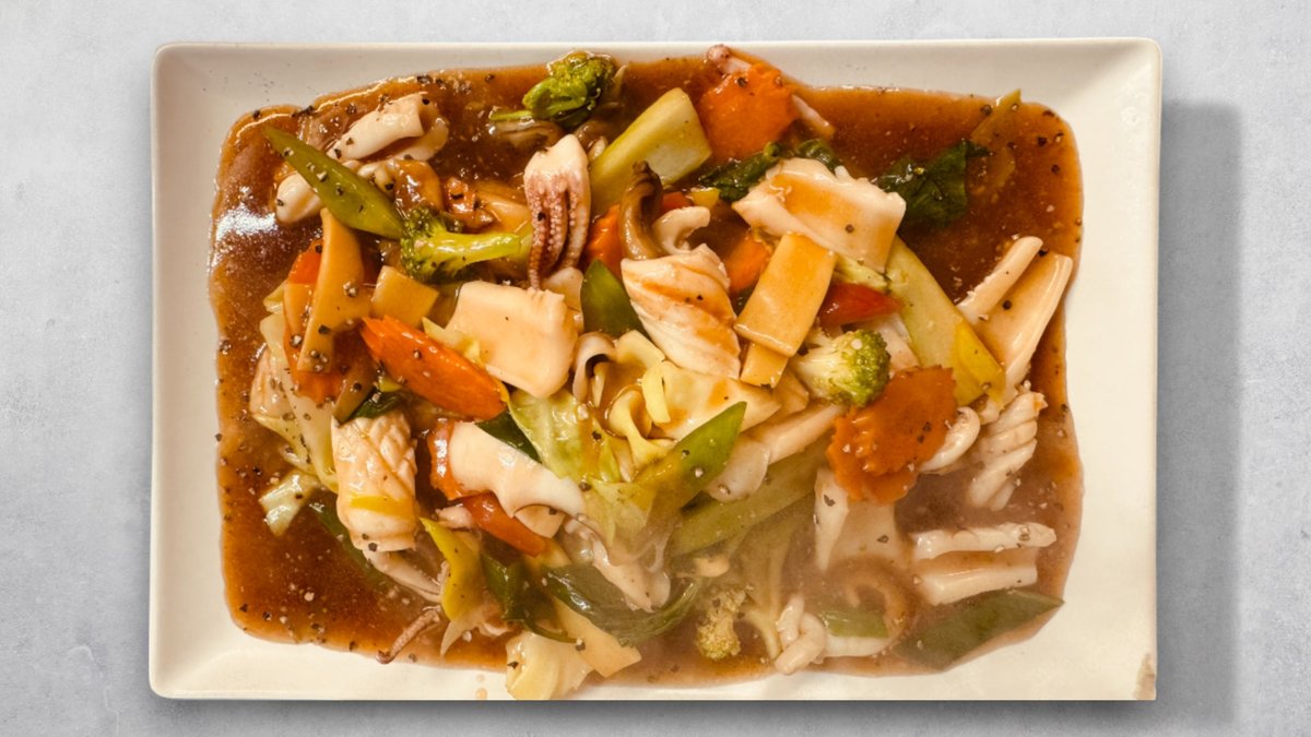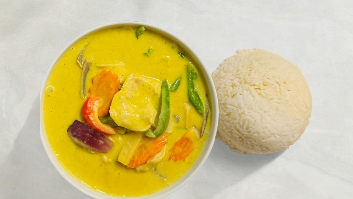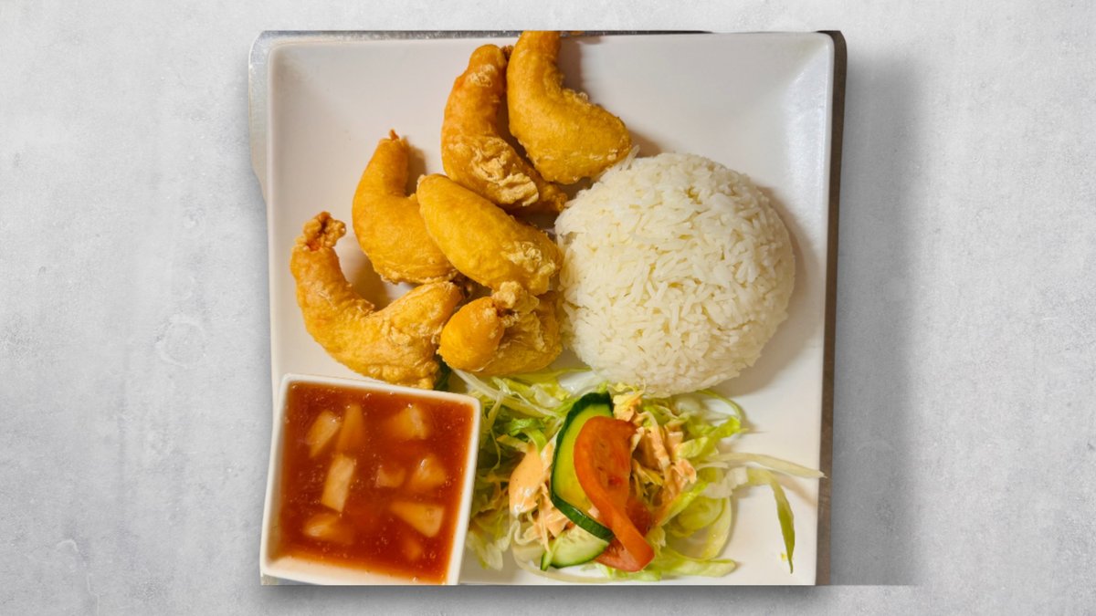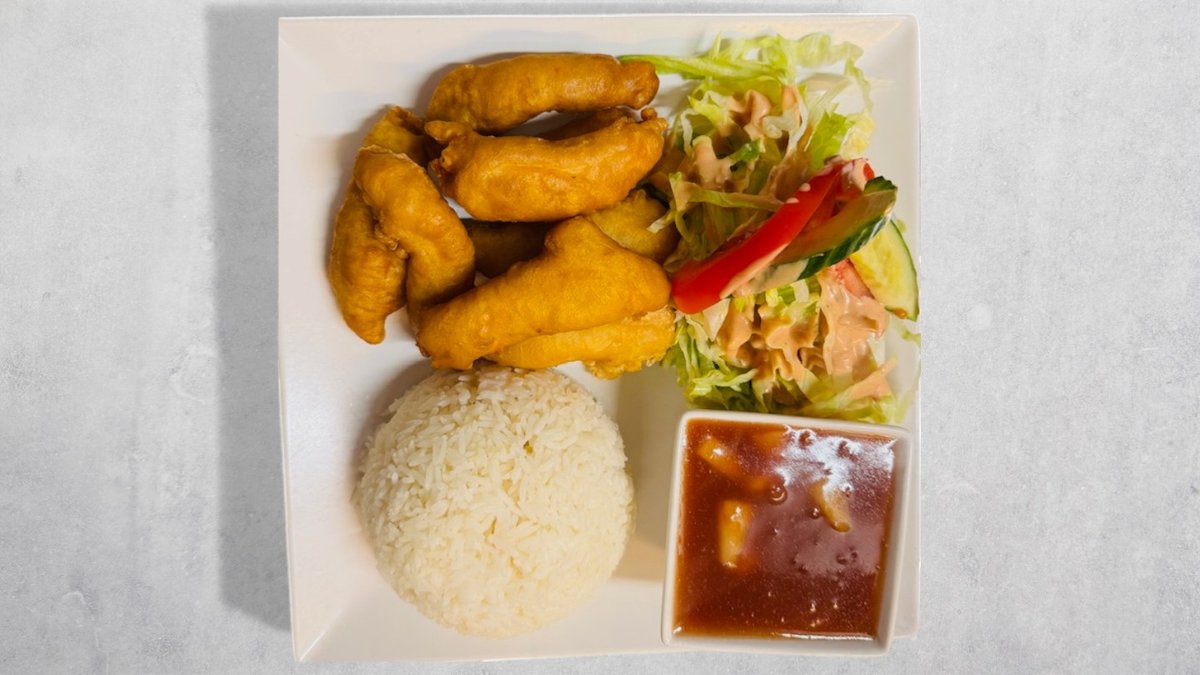 Serveres med valgfri protein, ris, løg, broccoli og sort pebersauce.