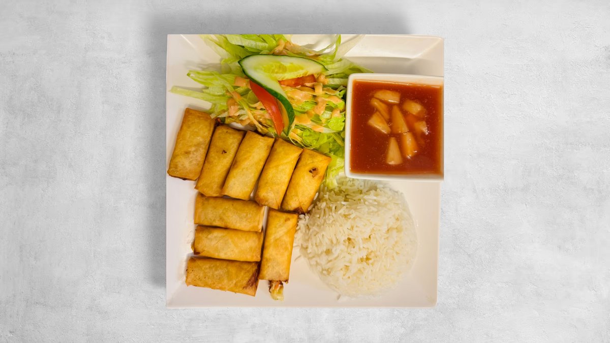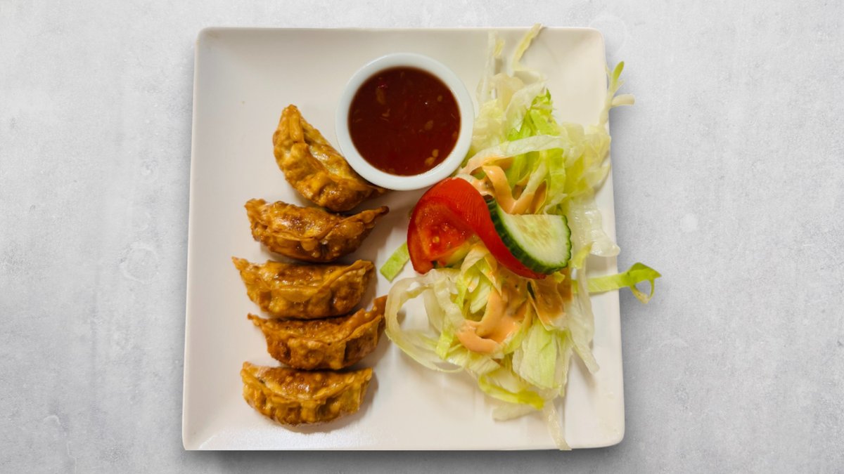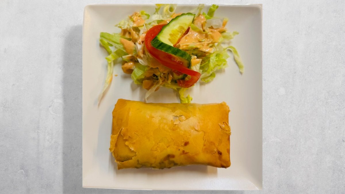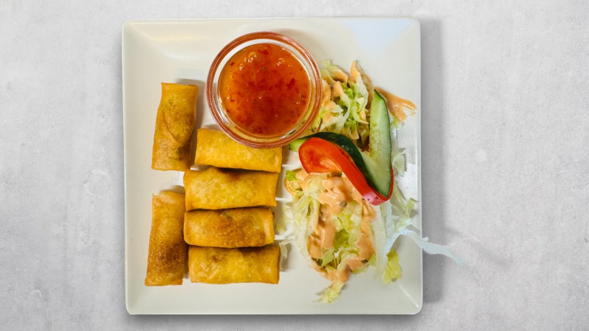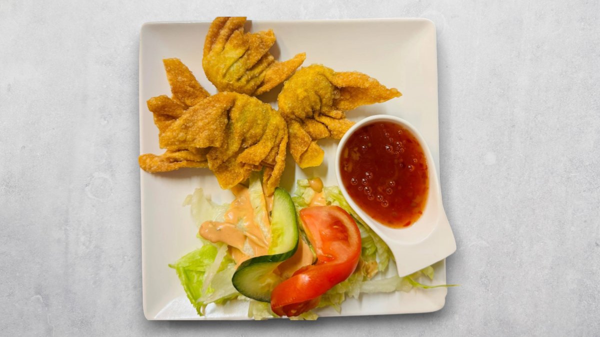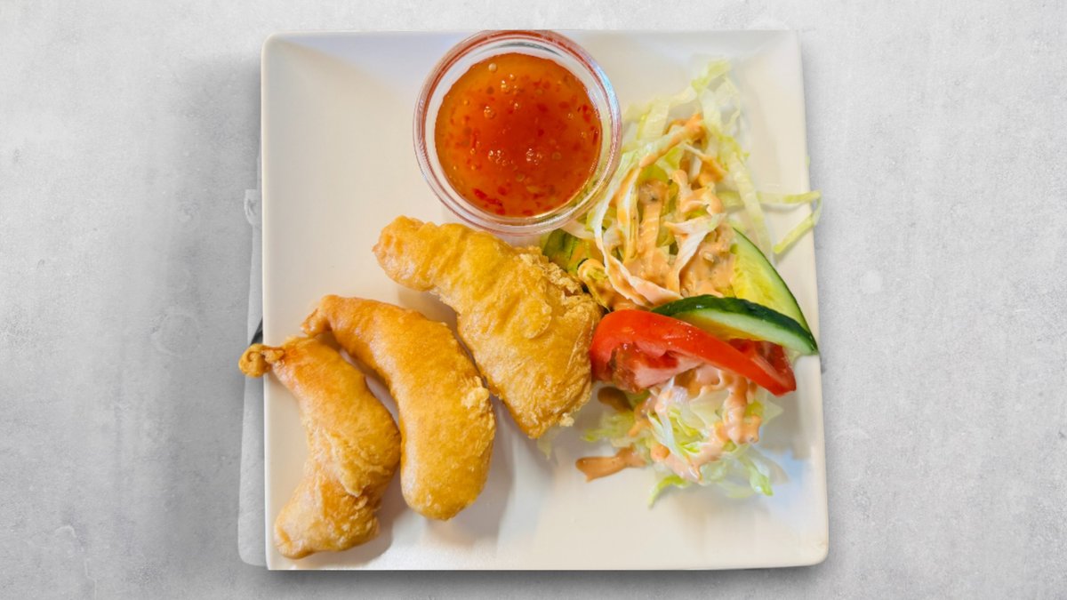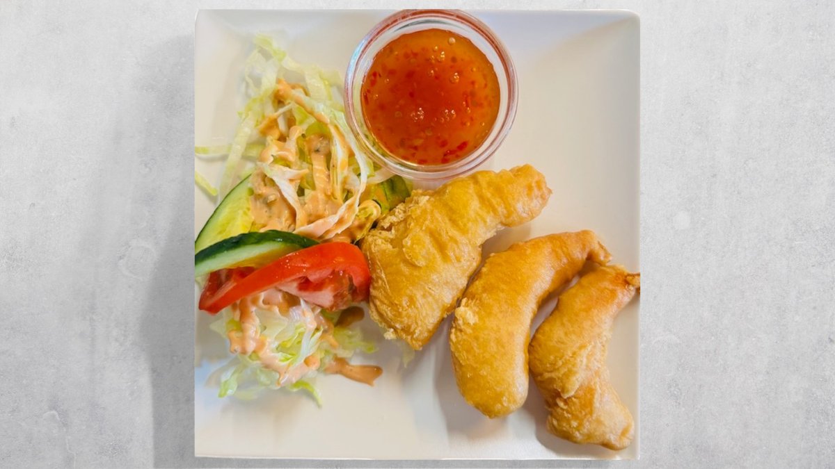 Friturestegte dejpakker med grøntsager severet med sød chilisauce.