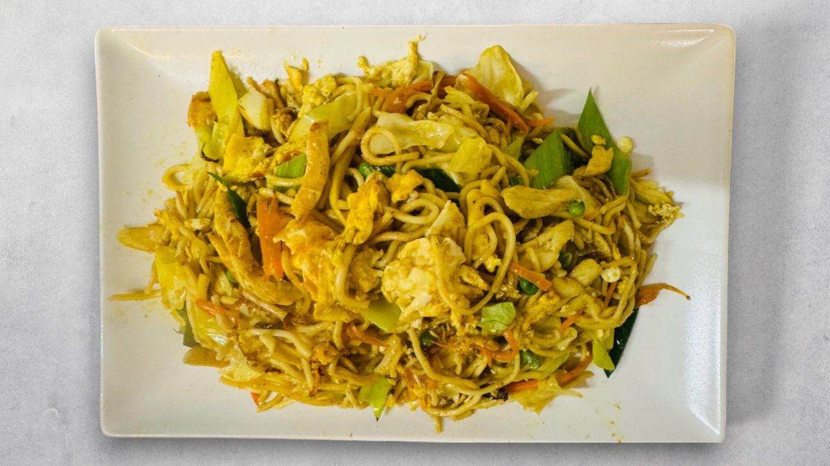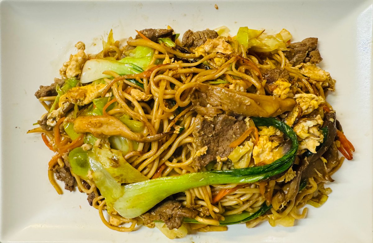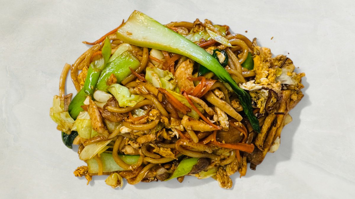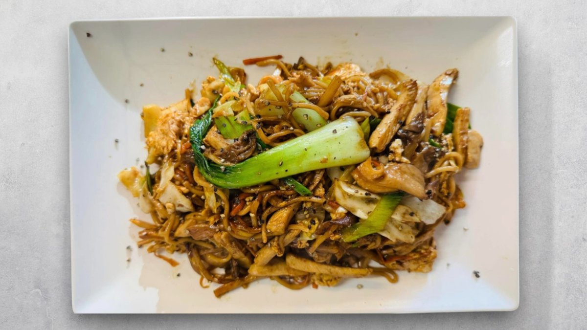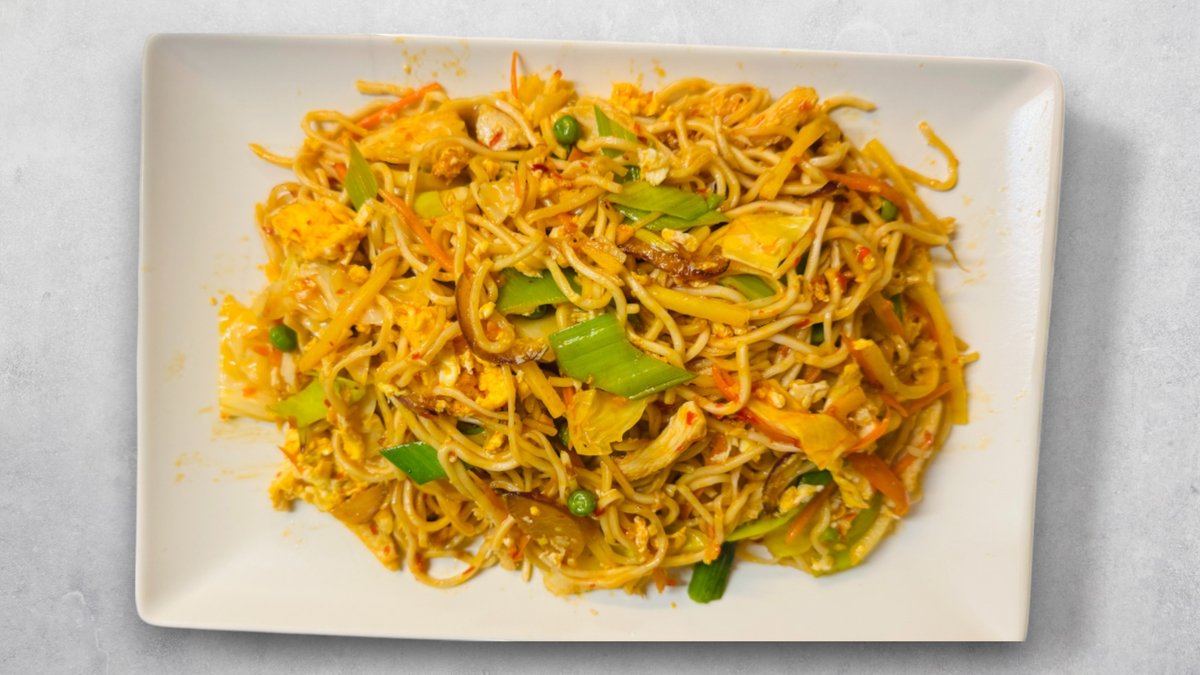 53. Stegte nudler med grøntsager, æg, og pebersauce