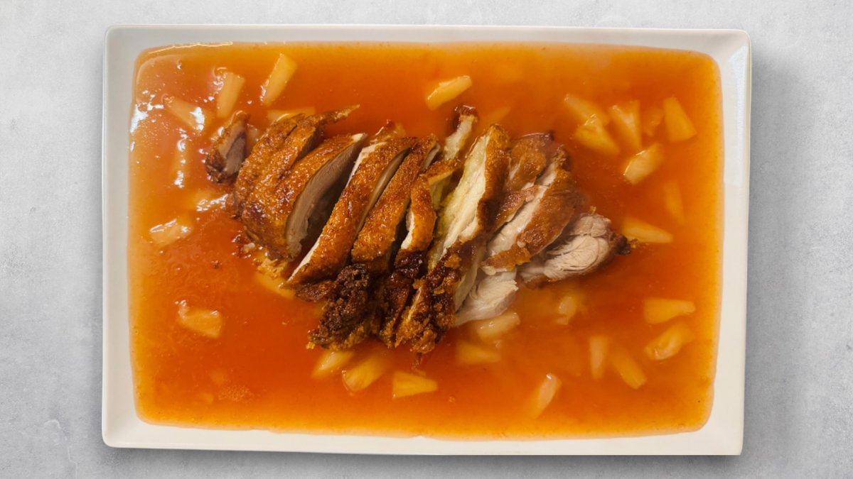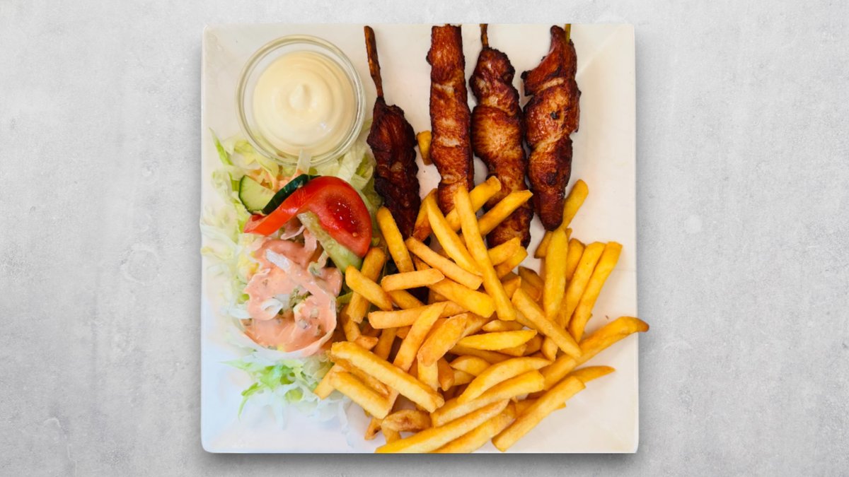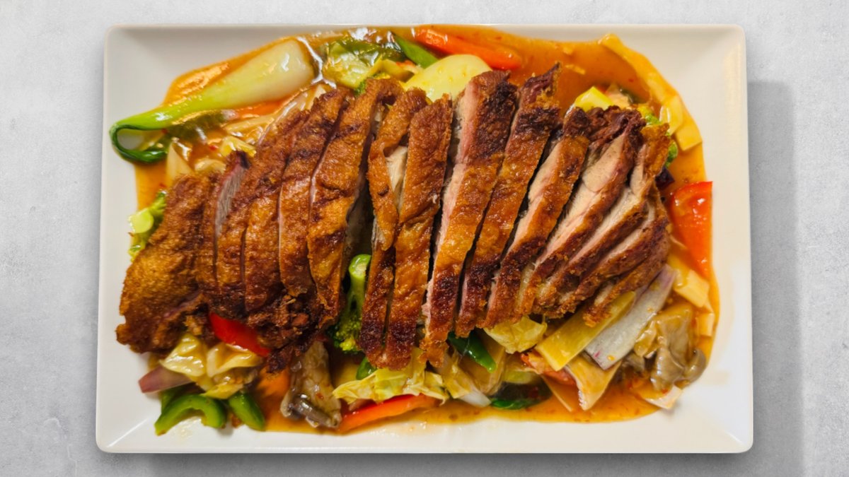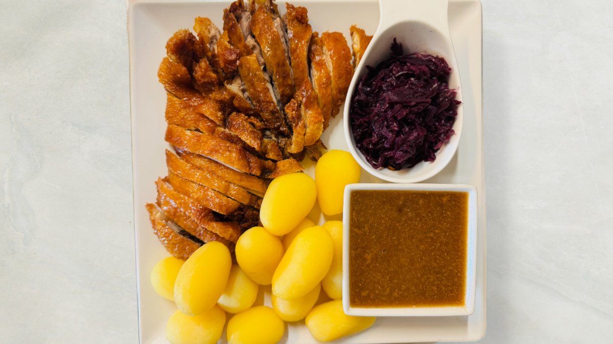Forretter: 2 x Pekingsuppe 4 x Mini forårsruller 4 x Tempurarejer 4 x Dybstegte dumplings med sød chili Hovedretter: Stegte udon nudler med oksekød Stegt and med grøntsager i hvidløg og chilisauce