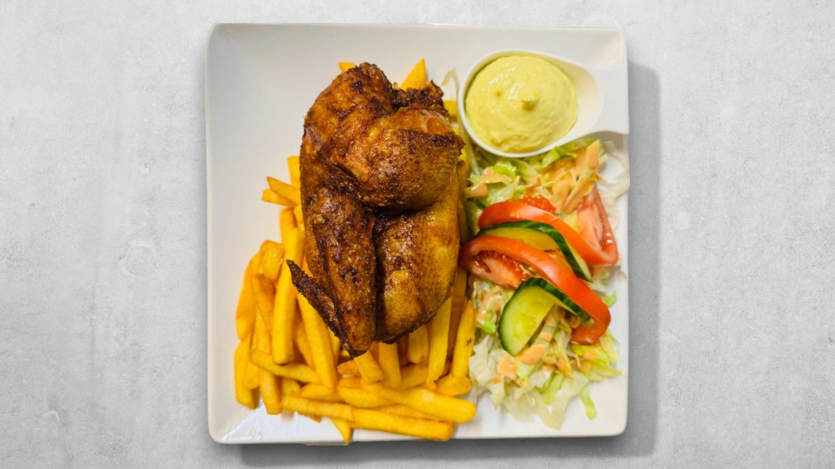 Servers med valgfri protein, grøntsager, æg og pebersauce.