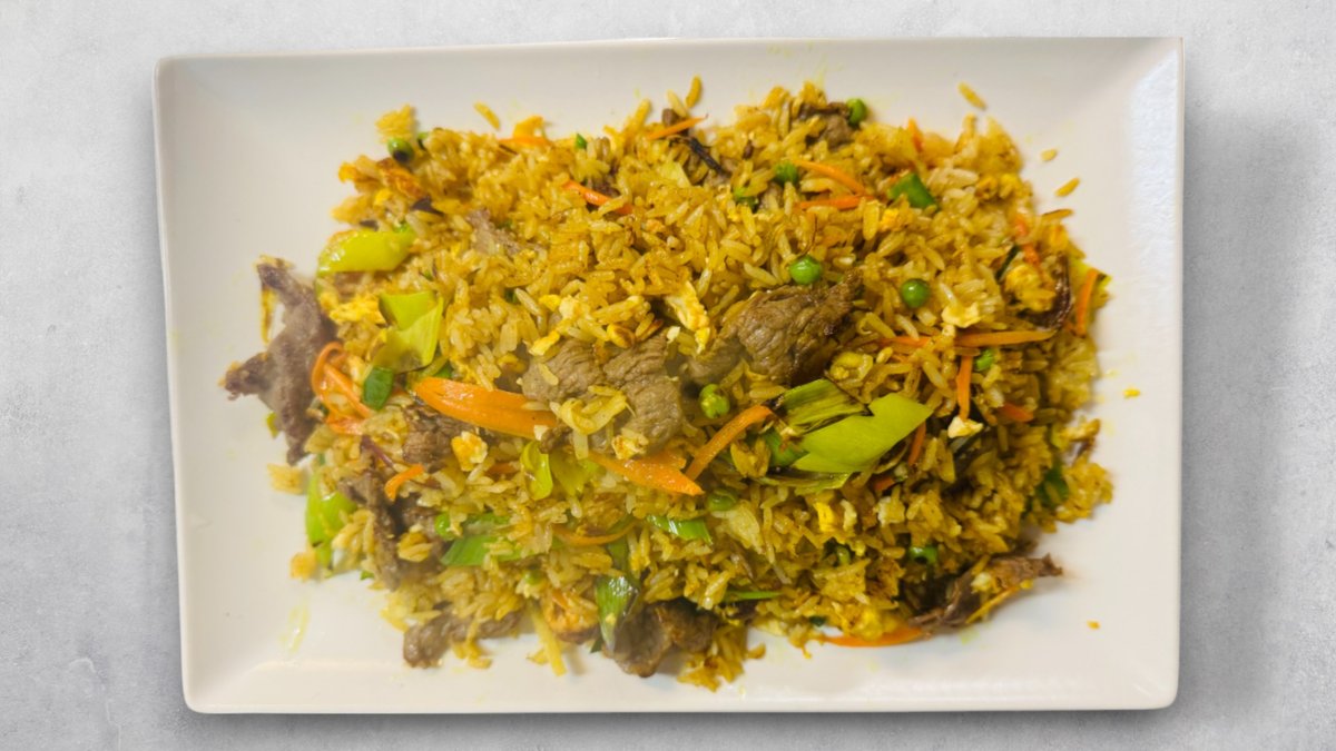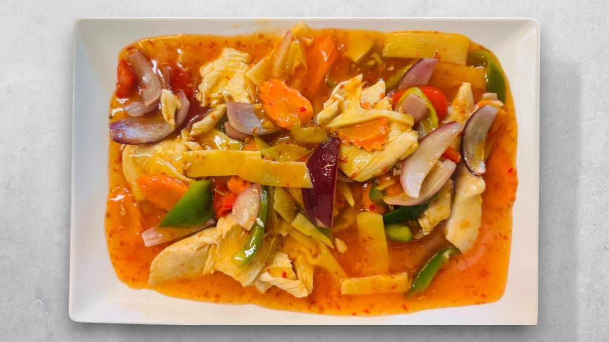 Serveres med valgfri protein, æg, forårsløg, hvidløg, gulerød, peberfrugt og chili sauce