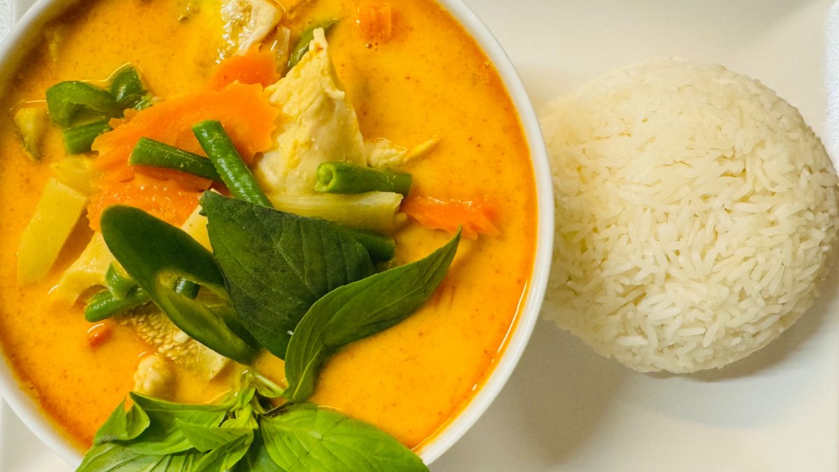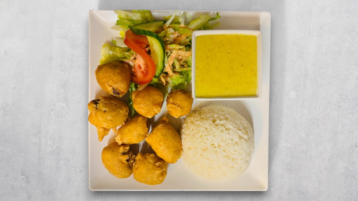 Med fyld af ris, hakket oksekød og karry krydderi serveret med soya.