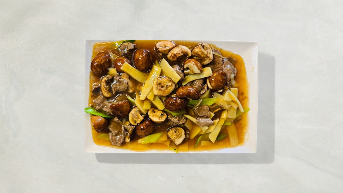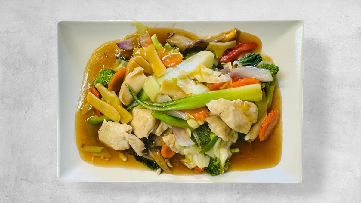 Servers med valgfri protein, grøntsager, æg og østersauce.