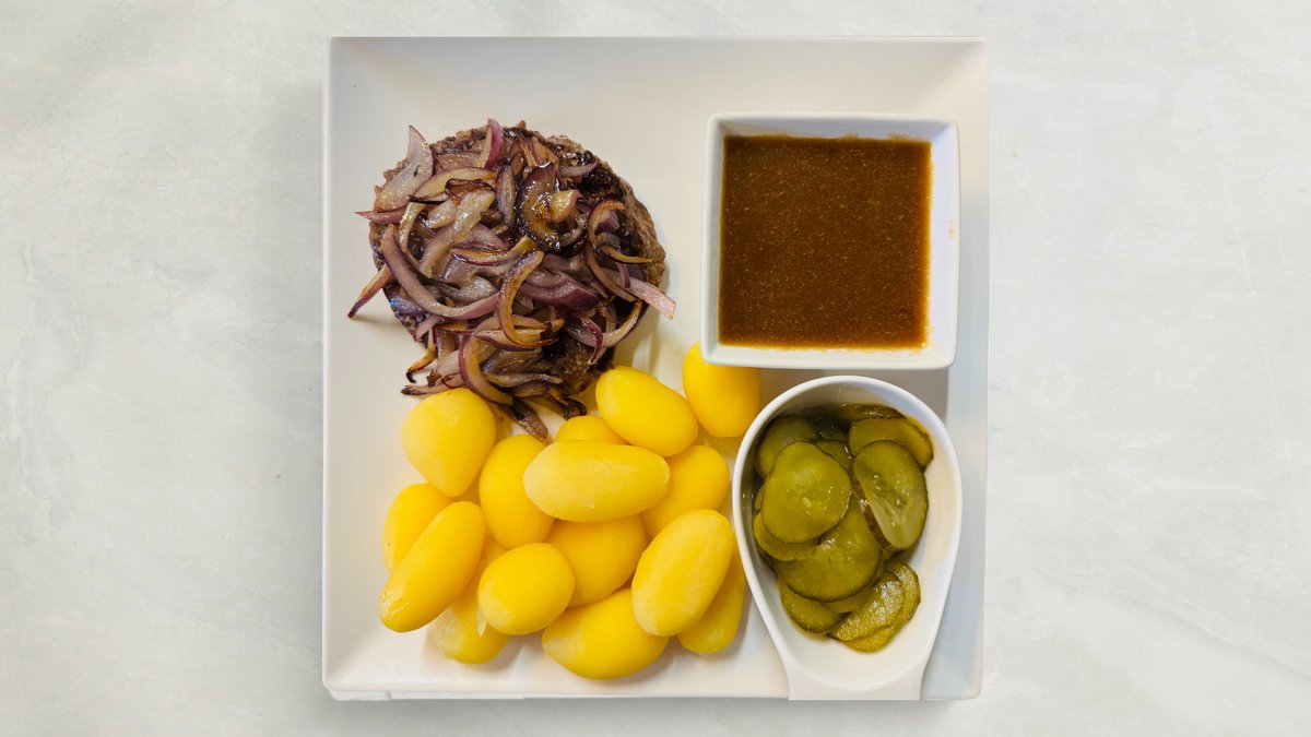 Serveres med bløde løg, kartofler, agurkesalat og brun sauce.