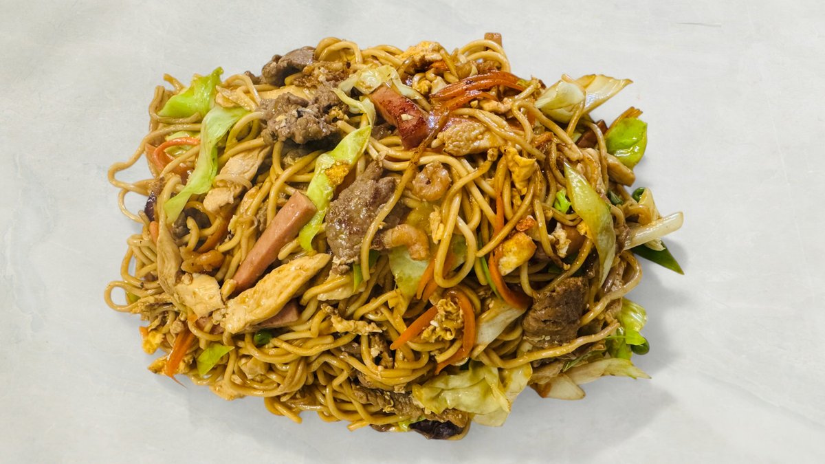 Med fyld af skinke, rejer, hakket oksekød og grøntsager serveret med soya.