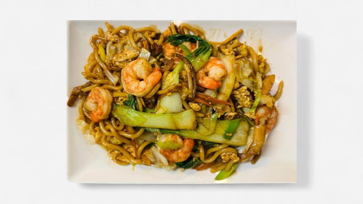 Forretter: 2 x Wonton suppe 4 x Indbagt tempurarejer 4 x Mini forårsruller 4 x Dybstegt kylling med sød chili Hovedretter: 2 x Stegte nudler med tigerrejer i østerssauce 2 x And i rød karry -Stærk