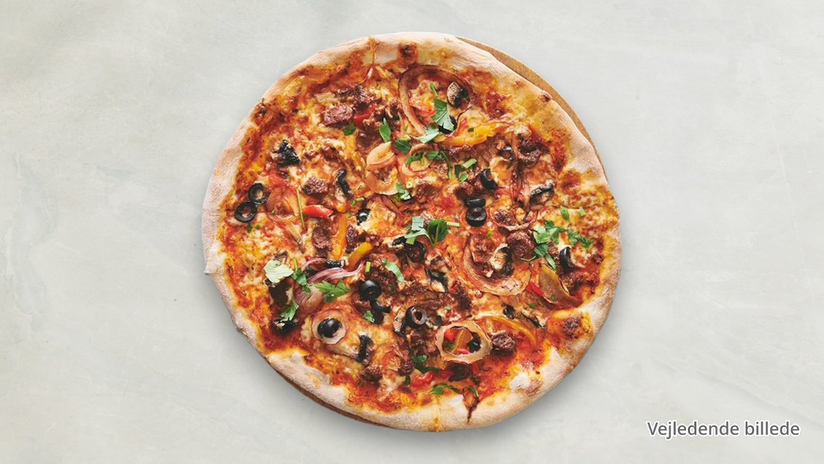 Tomat, ost, champignon, kødstrimler, paprika, spinat, chili og hvidløg.