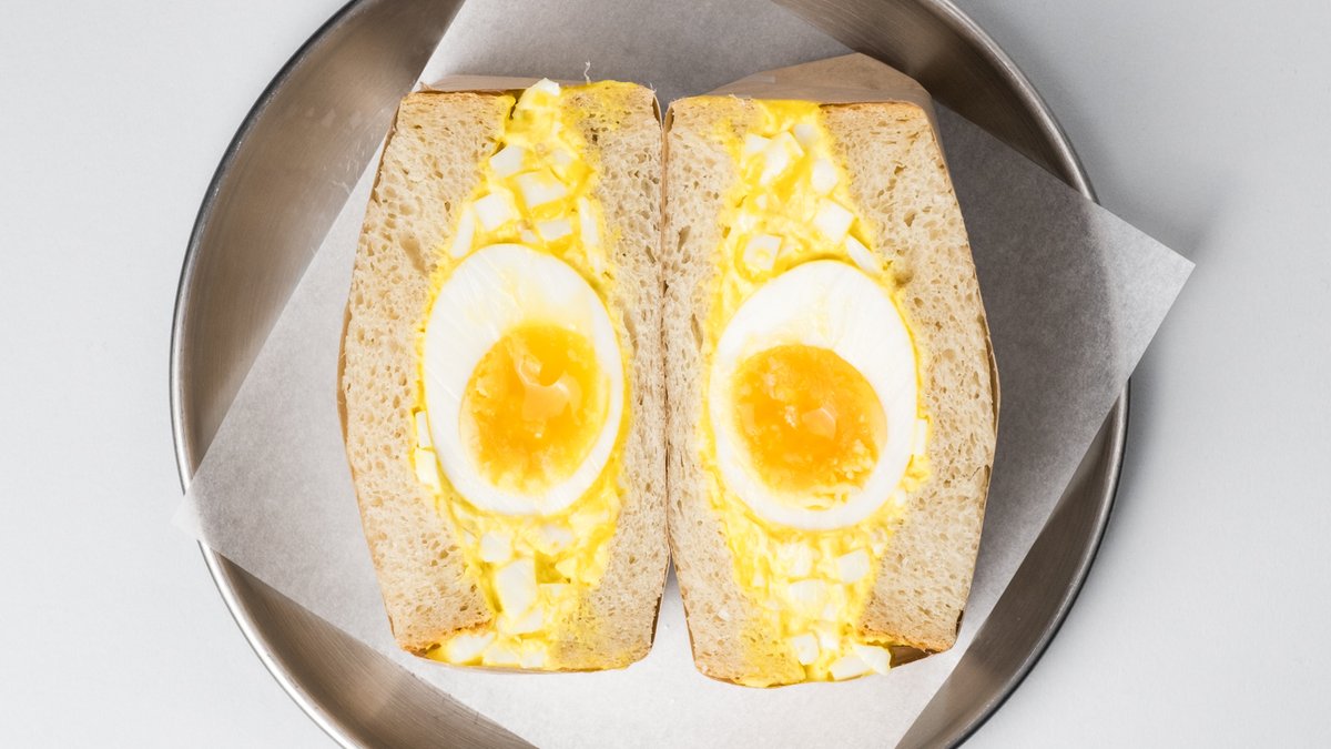 Vores ikoniske surdejs- & kartoffelbrød, vores æggesalat & blødkogt gurkemejeæg.